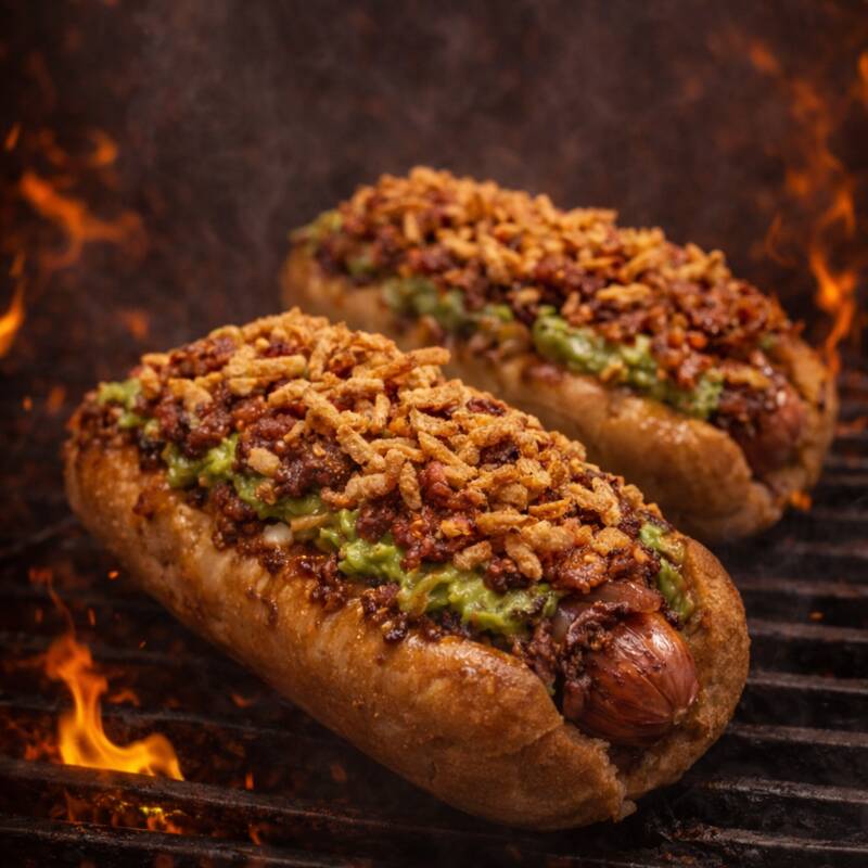 Salchicha 100% de res, bañada en queso cheddar derretido, nuestro exclusivo guiso de cebolla, guacamole cremoso y el toque final de cebollita crunchy y tocino.