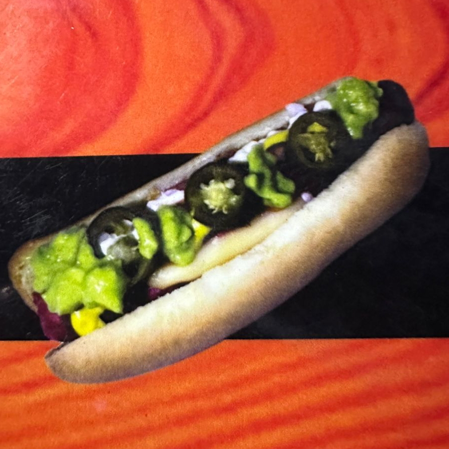 Salchicha de pavo gigante, queso y tocineta montado en pan casero gigante, incluye papas fritas.