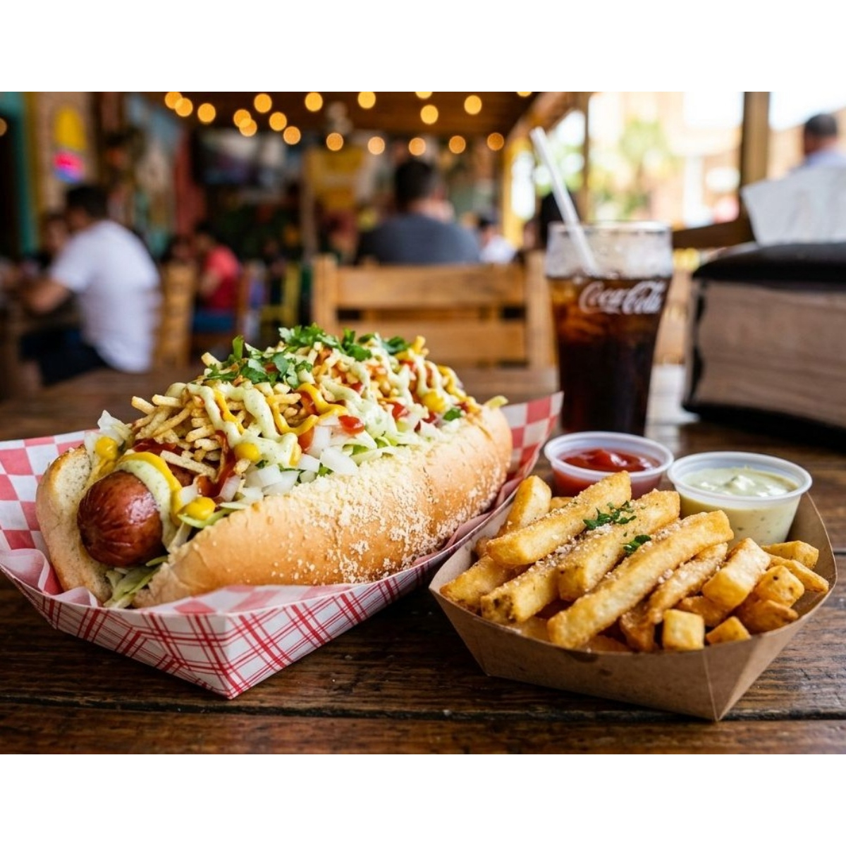 Pan, salchicha, mayonesa, cebolla ,tomate y cátsup. Acompañado de papas fritas.