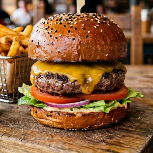 Hamburguesa con carne , queso amarillo derretido , tomate , cebolla y lechuga