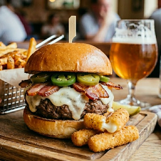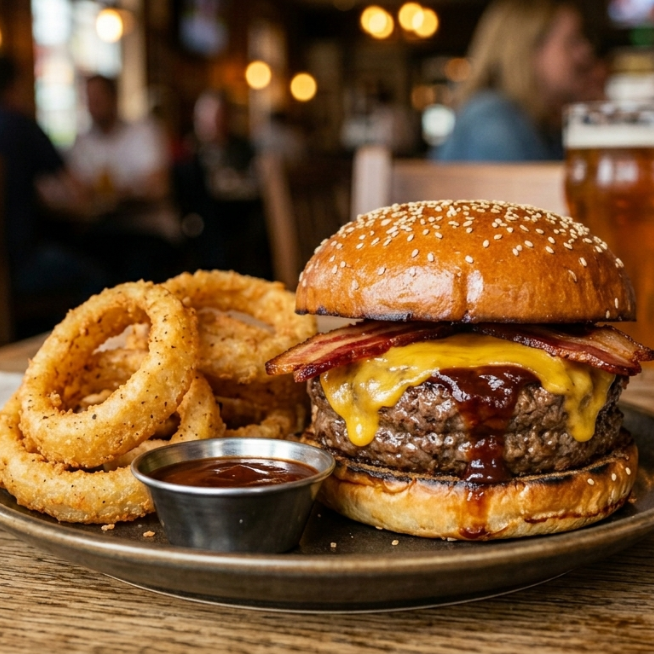 Hamburguesa con doble carne , queso amarillo derretido , tocino y cebolla empanizada