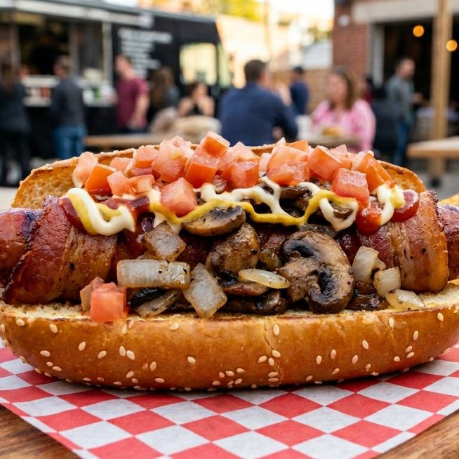 dogo salchicha con tocino , tomate , cebolla y champiñones