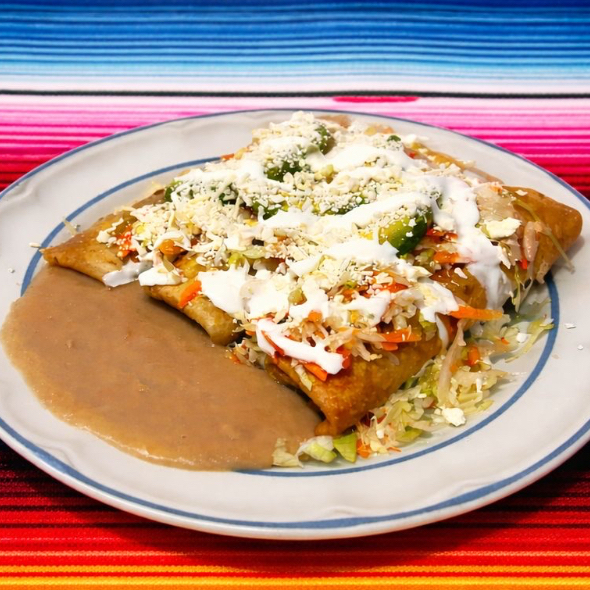 3pzas de burritos de harina dorados, rellenos de pollo desmenuzado guisadito, con sus verduras y queso oreado por encima, acompañados de frijolitos calientitos.