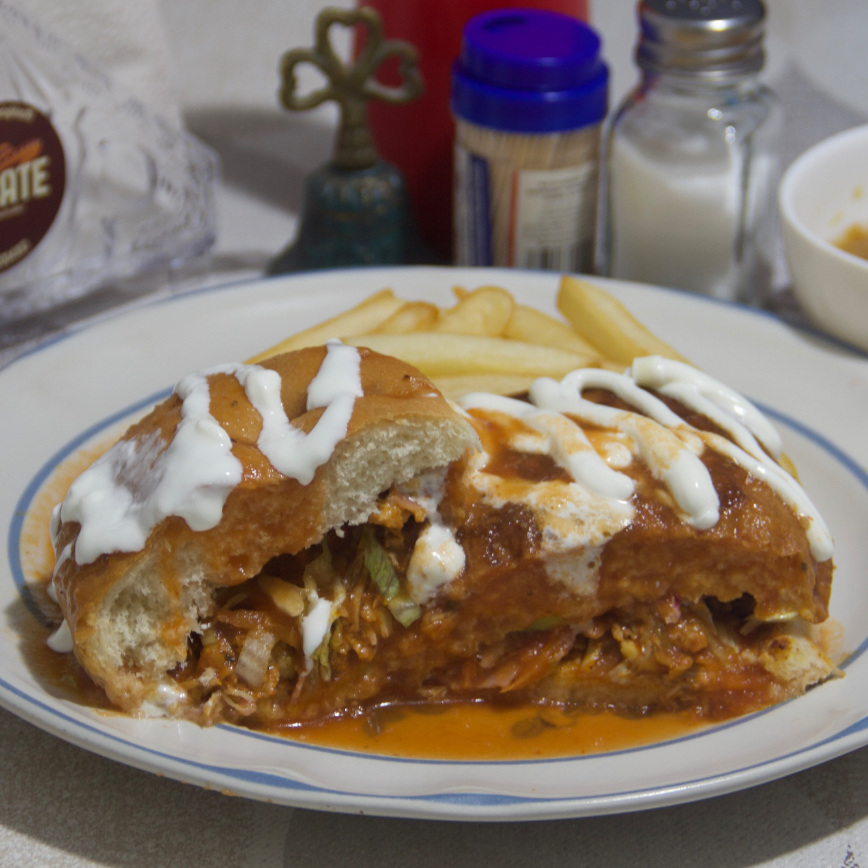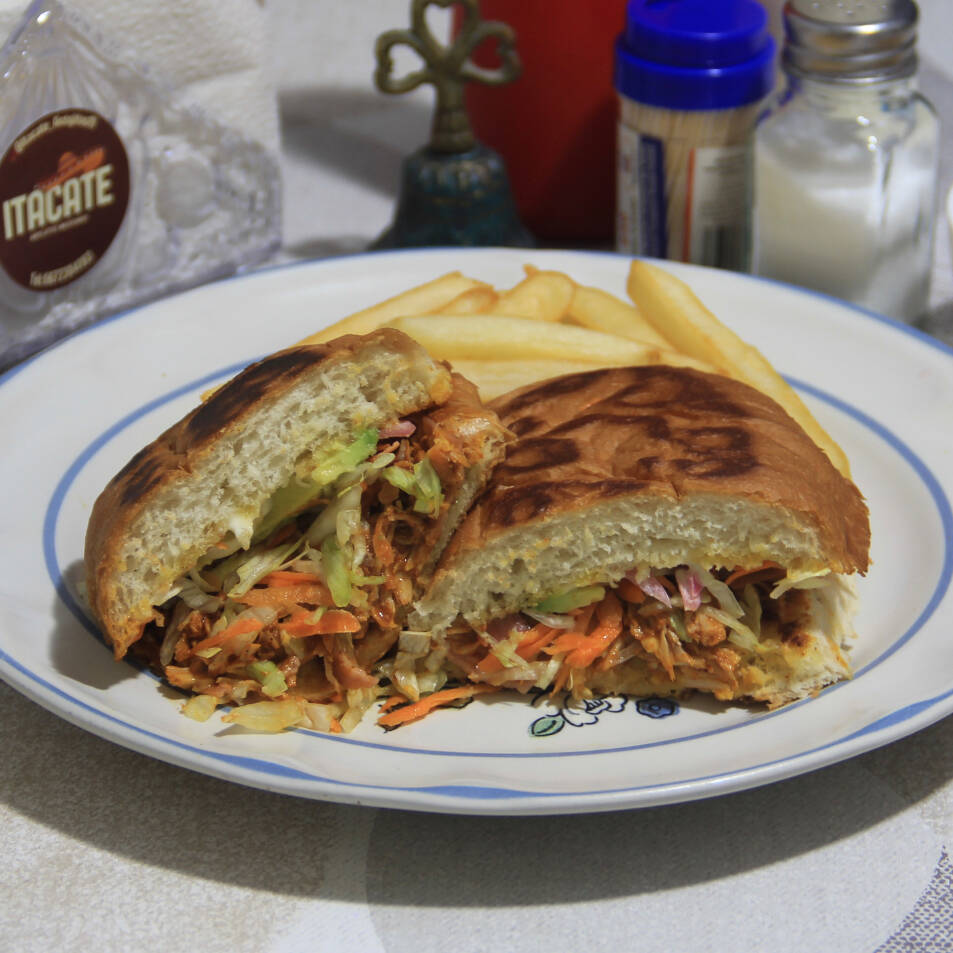 Pan, cochinita casera, jamón, queso americano y sus verduras, bañada en su caldito de tomate picosito. Acompañada de papas fritas.