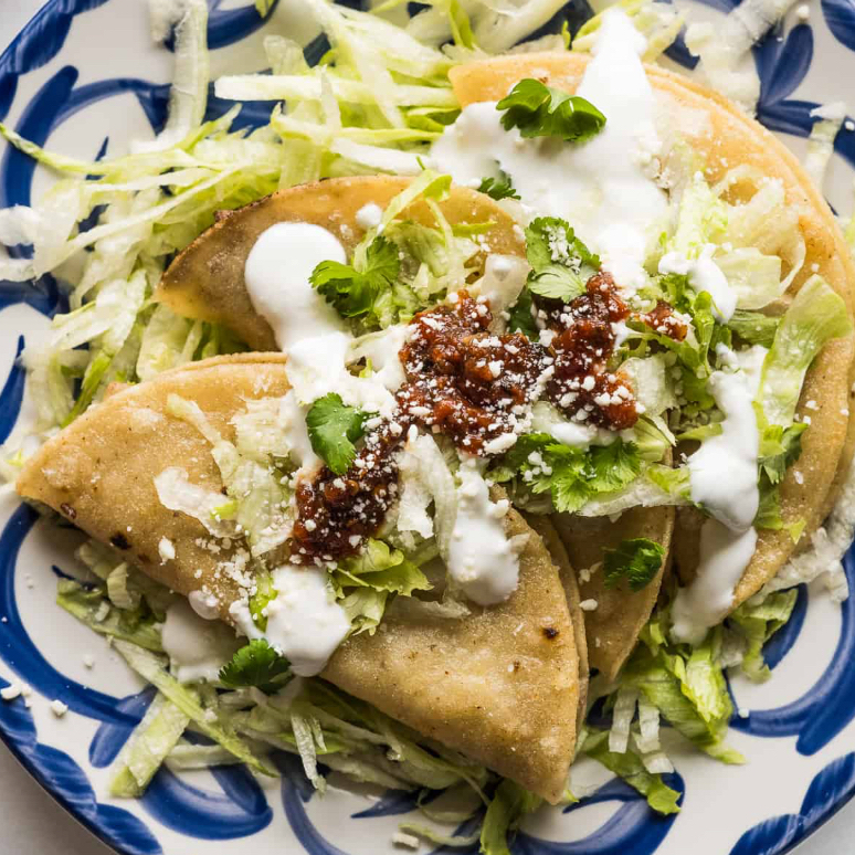 3pzas de gorditas recién hechas. Pollo desmenuzado, frijol, sus verduras y quesito oreado por encima.