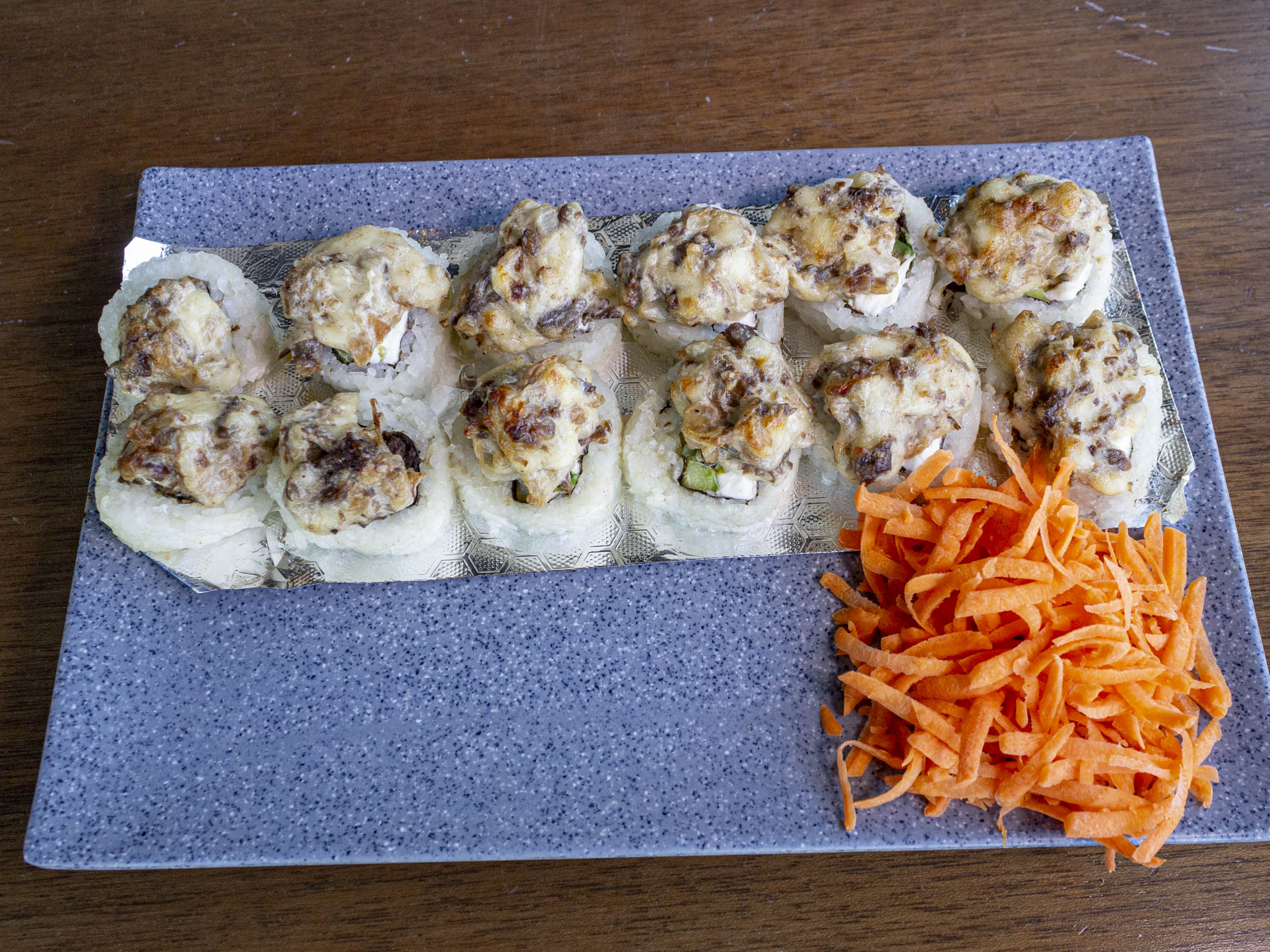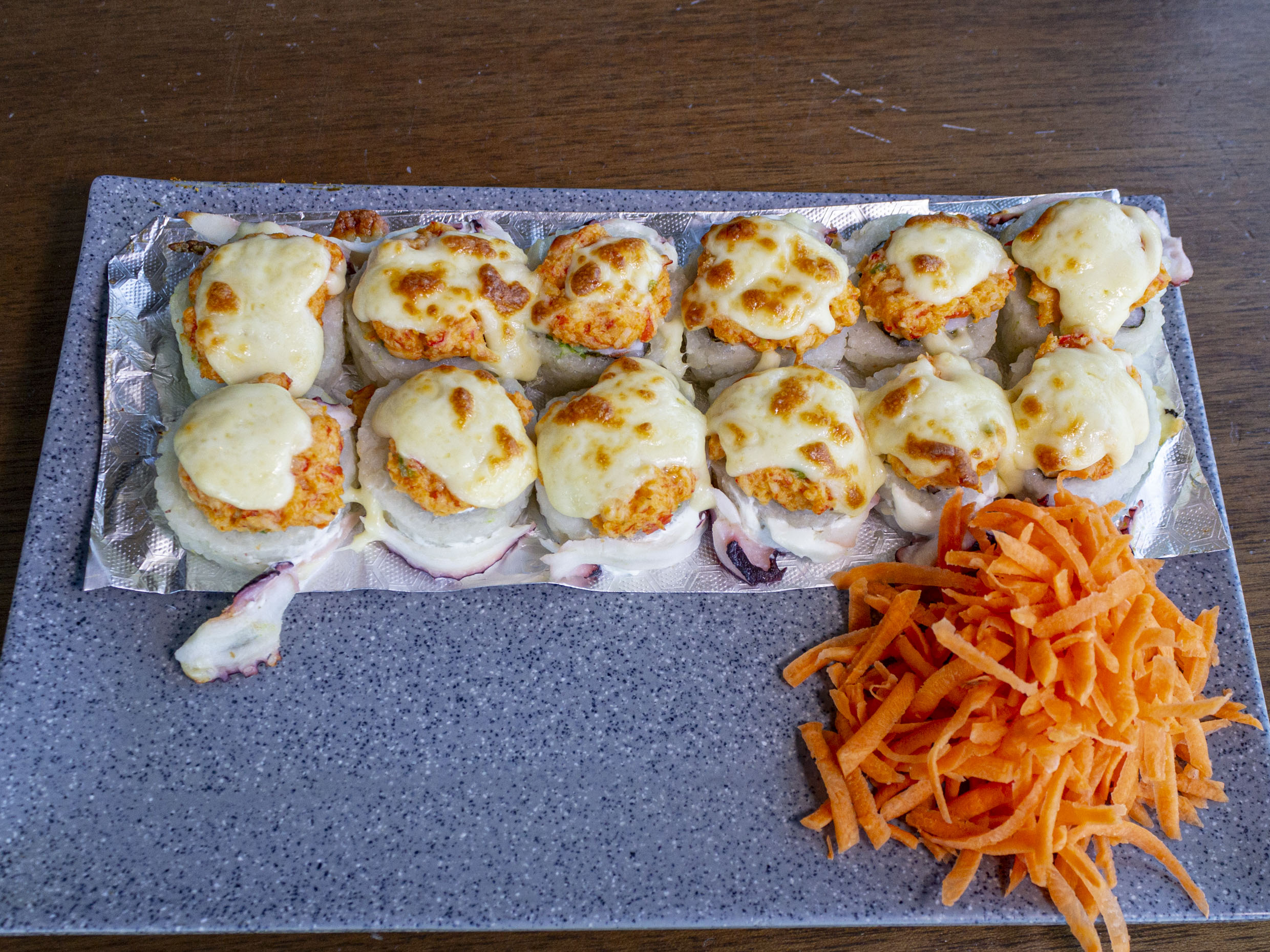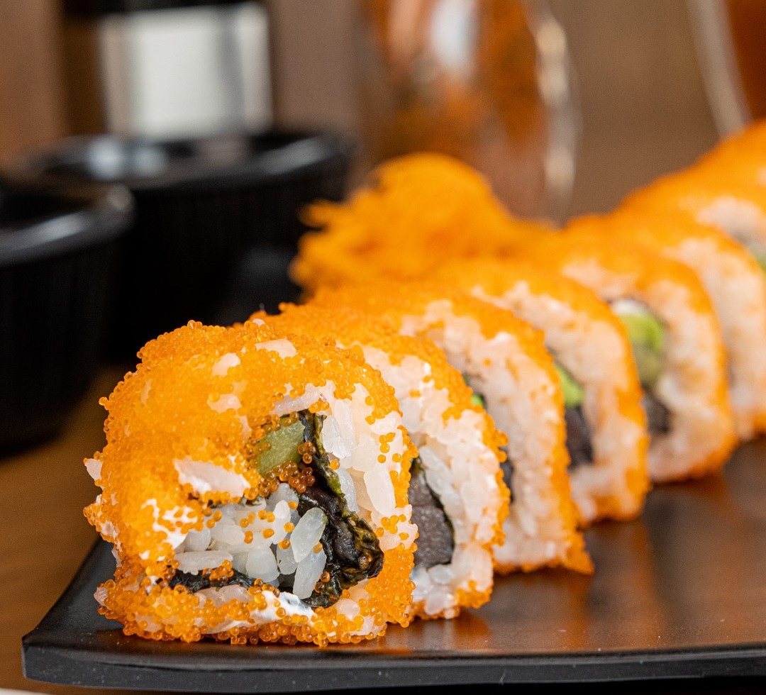 12 pz. Res, phila, surimi, pepino y aguacate por dentro. Gratinado por fuera.