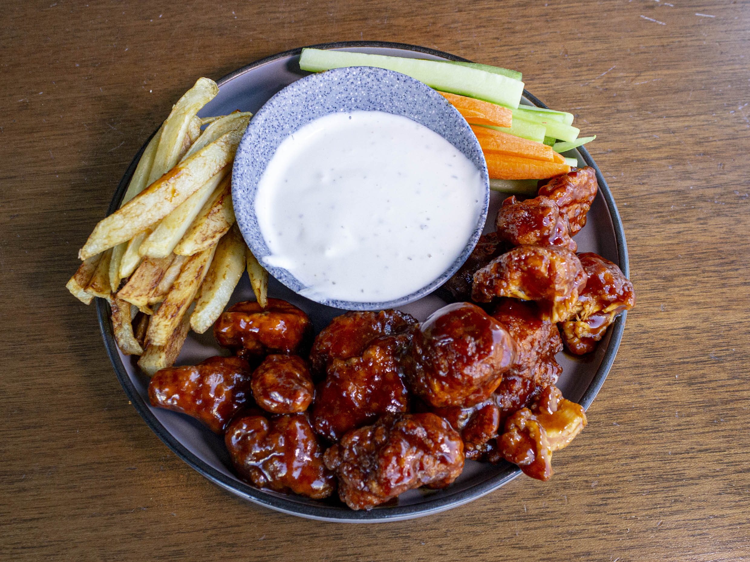 340gr. Boneless acompañados de vegetales, papas a la franceza y aderezo ranch