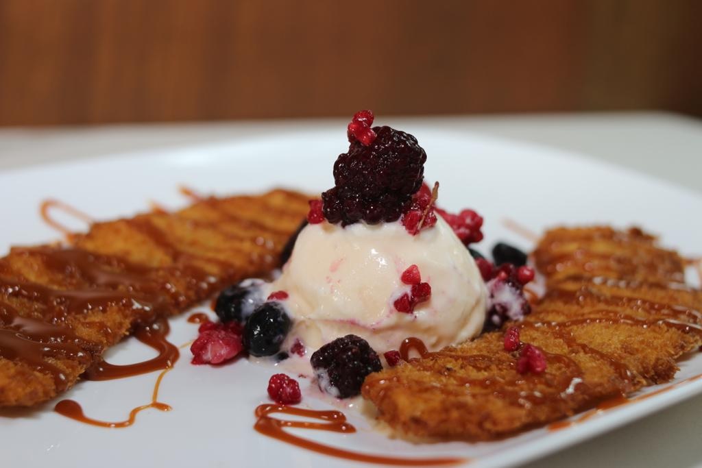 Plátano macho bañado con cajeta, bola de nieve de vainilla y frutos.