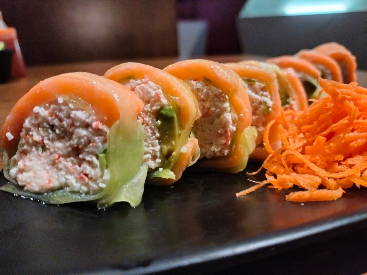 12 pz. Atun, phila, aguacate, surimi y pepino por dentro. Por fuera salmón y salsa de anguila.