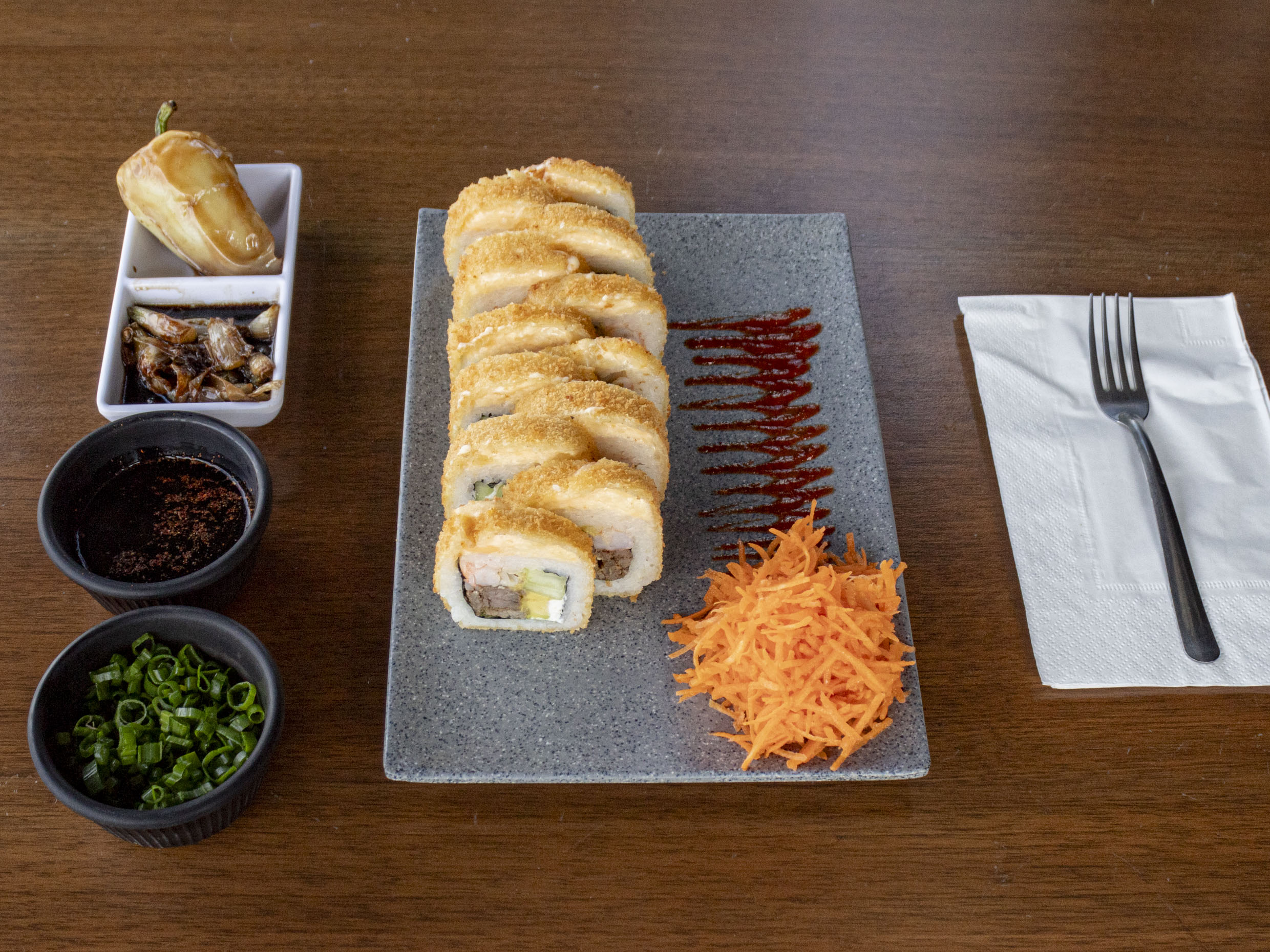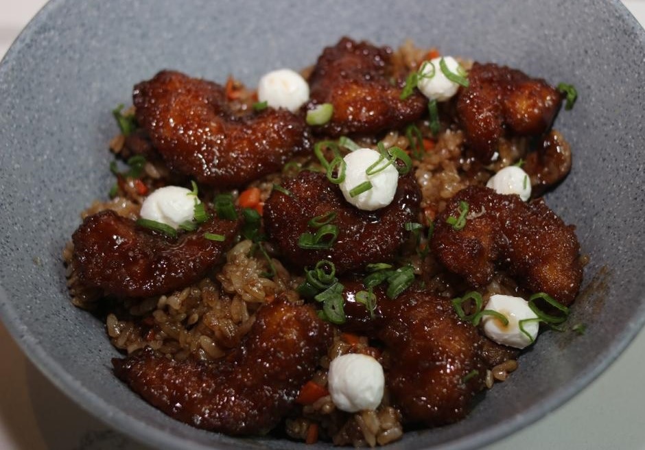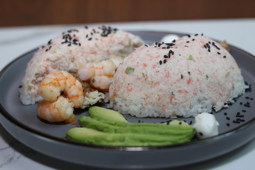320 Gramos de arroz frito endulzado ligeramente y zanahoria. Arriba camarón empanizado caramelizado, aguacate, cebollín y phila.