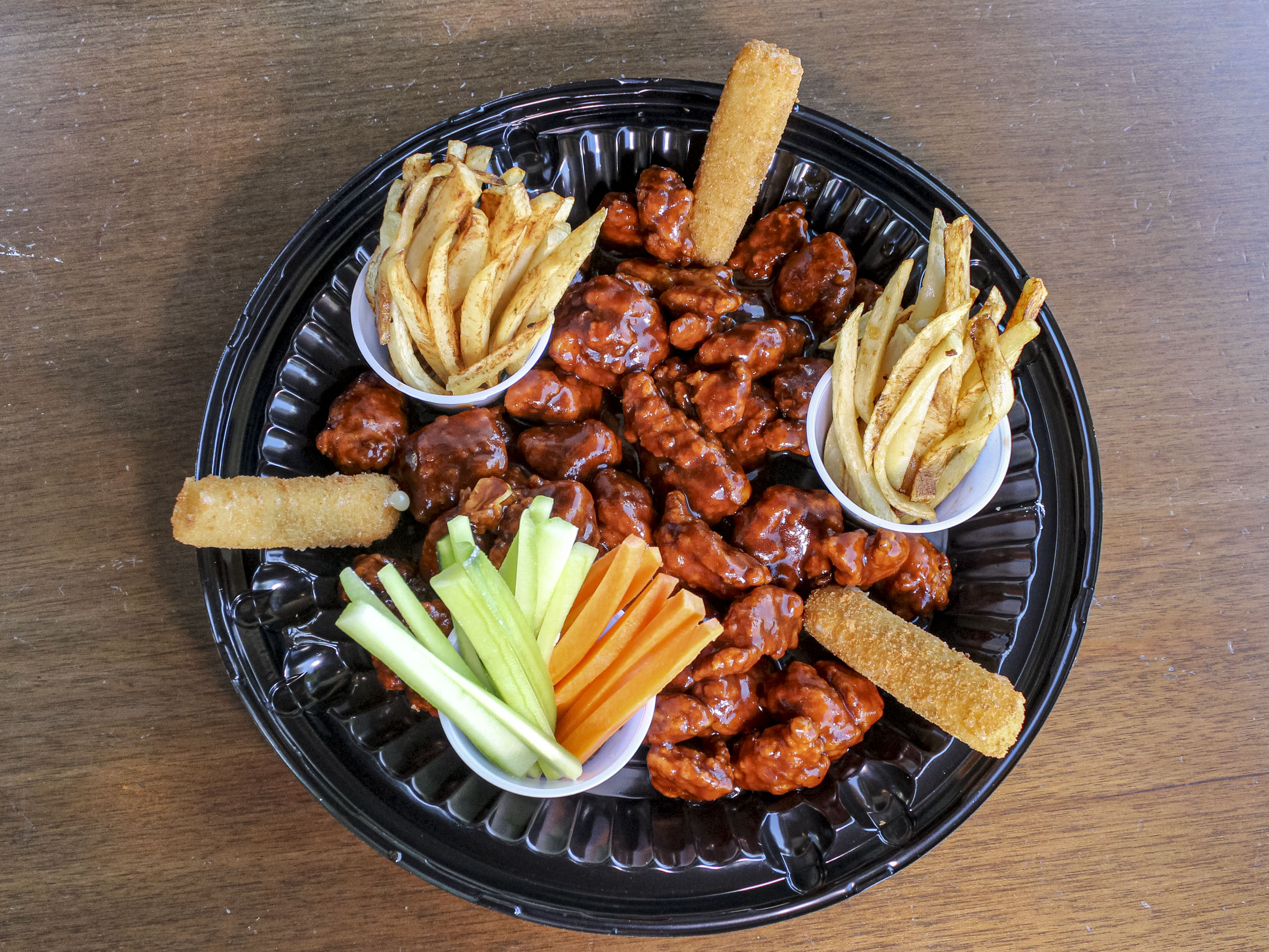 3 ordenes de boneless con papas francesas, vegetales y 1 orden de dedos de queso