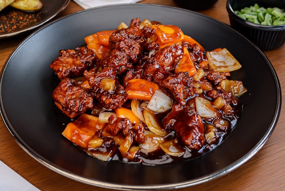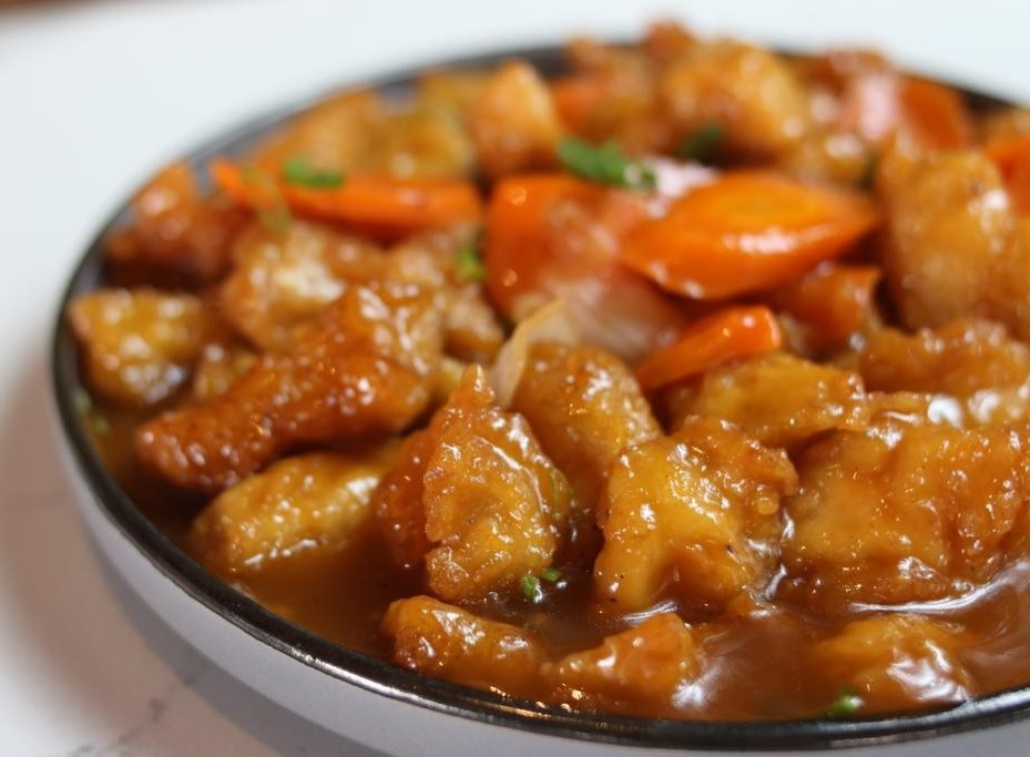200 gr. Pollo empanizado, zanahoria, cebolla blanca, pimiento amarillo y gravy agridulce