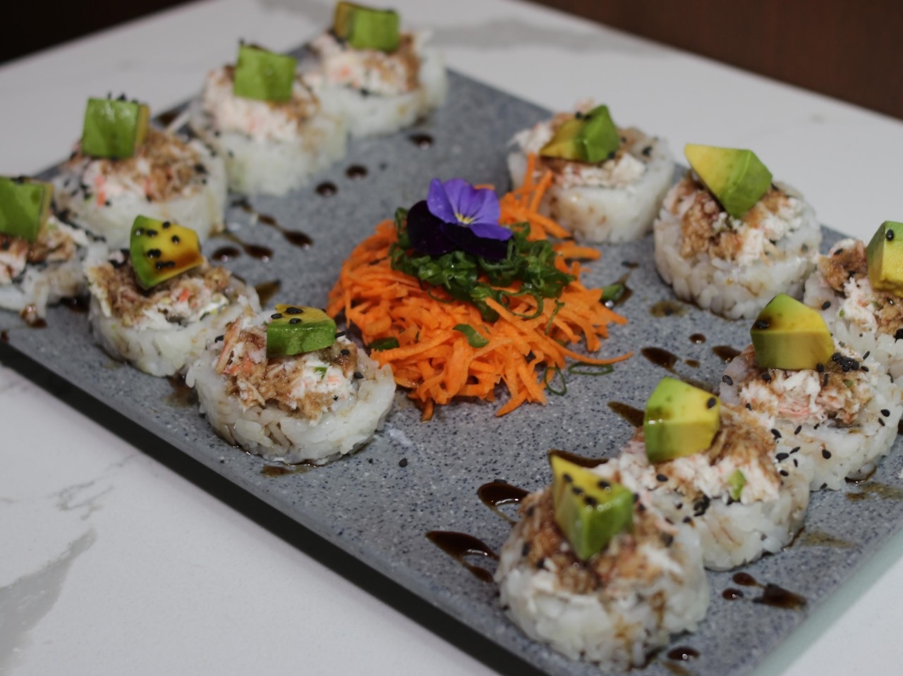 12 pzas. Philadelphia, aguacate, pepino y camaron por dentro. Por fuera pulpo, tampico spicy y queso chihuahua bañado en anguila.