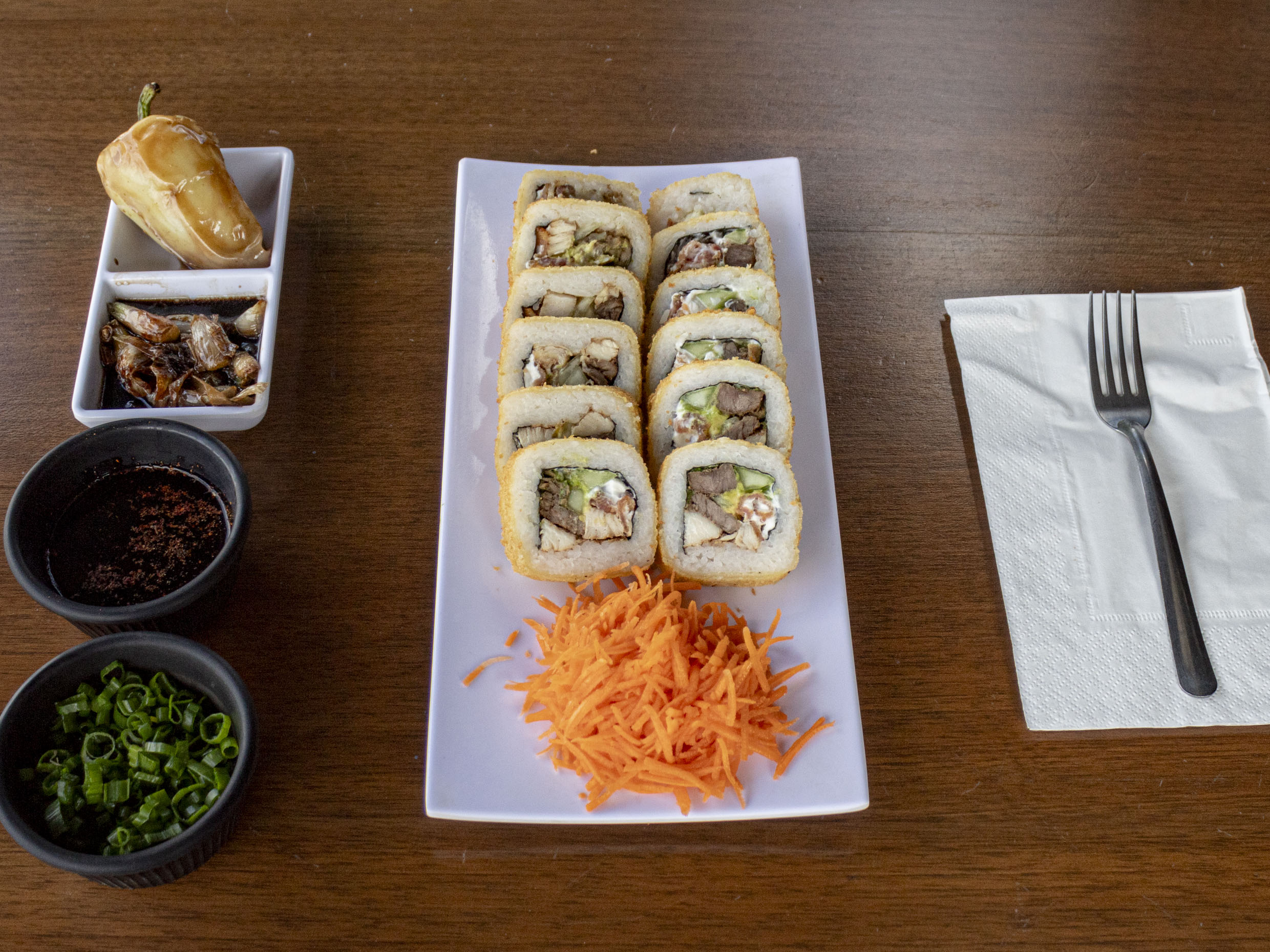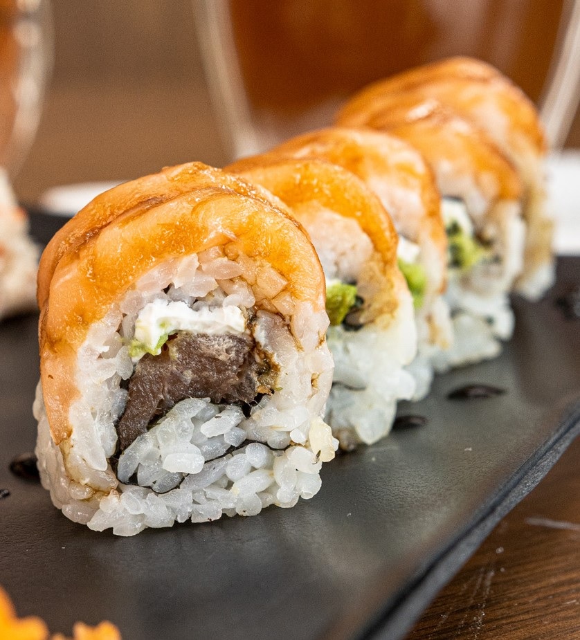 12 pz. Atún, phila, aguacate y pepino por dentro. Por fuera camarón empanizado y caramelizado.