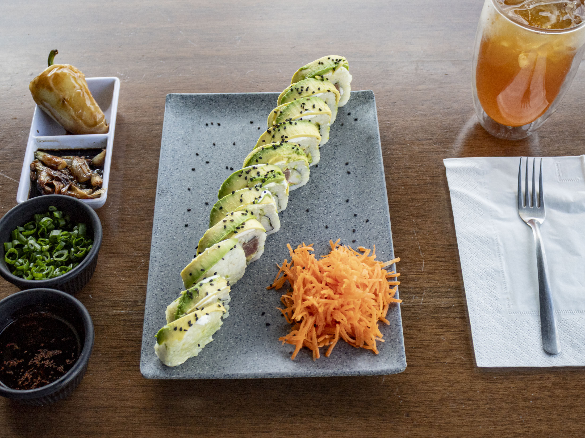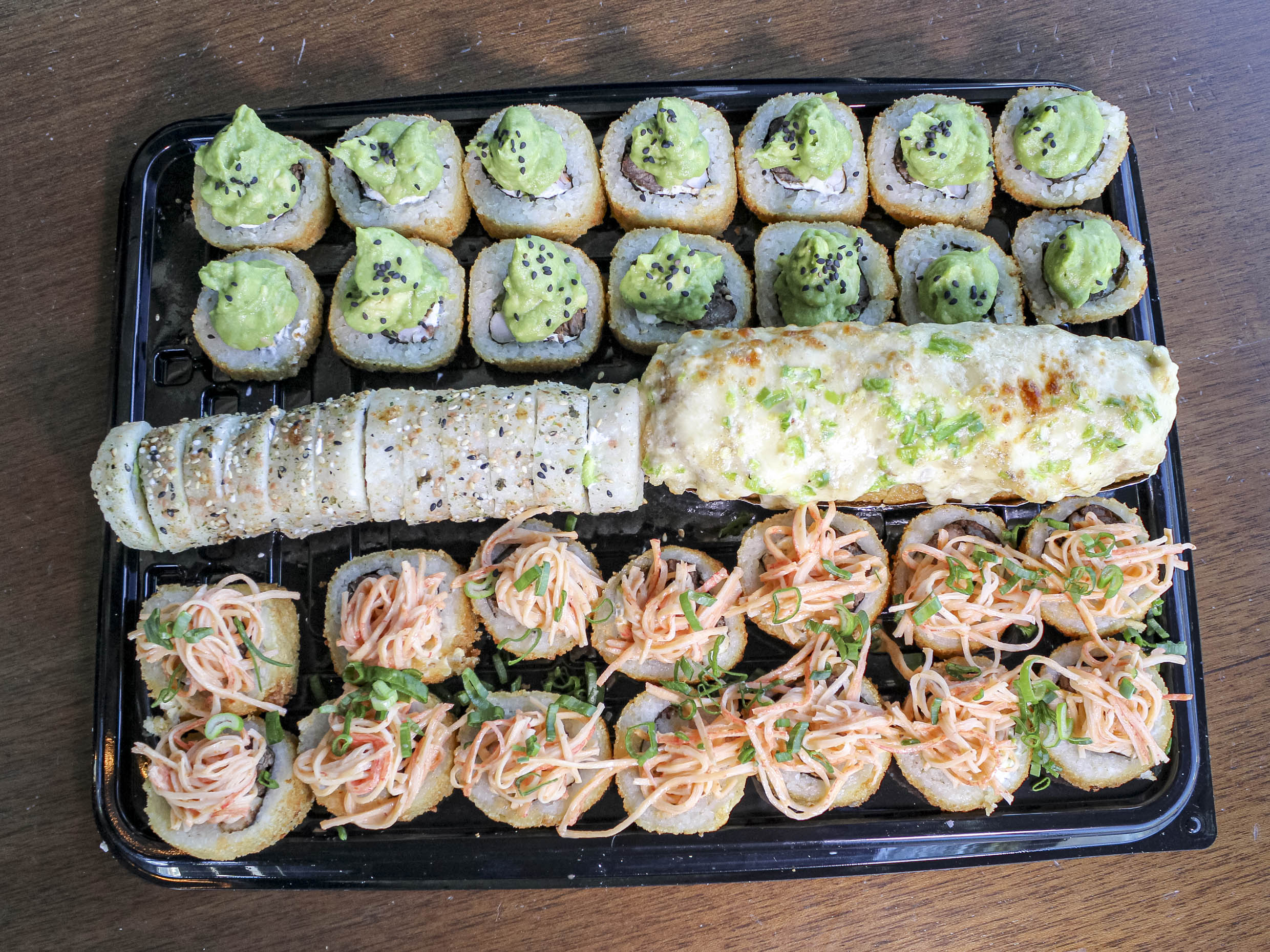 1 sushi guacamole, 1 sushi bacalao, 1 sushi shilo, 1 sushi pelirrojo