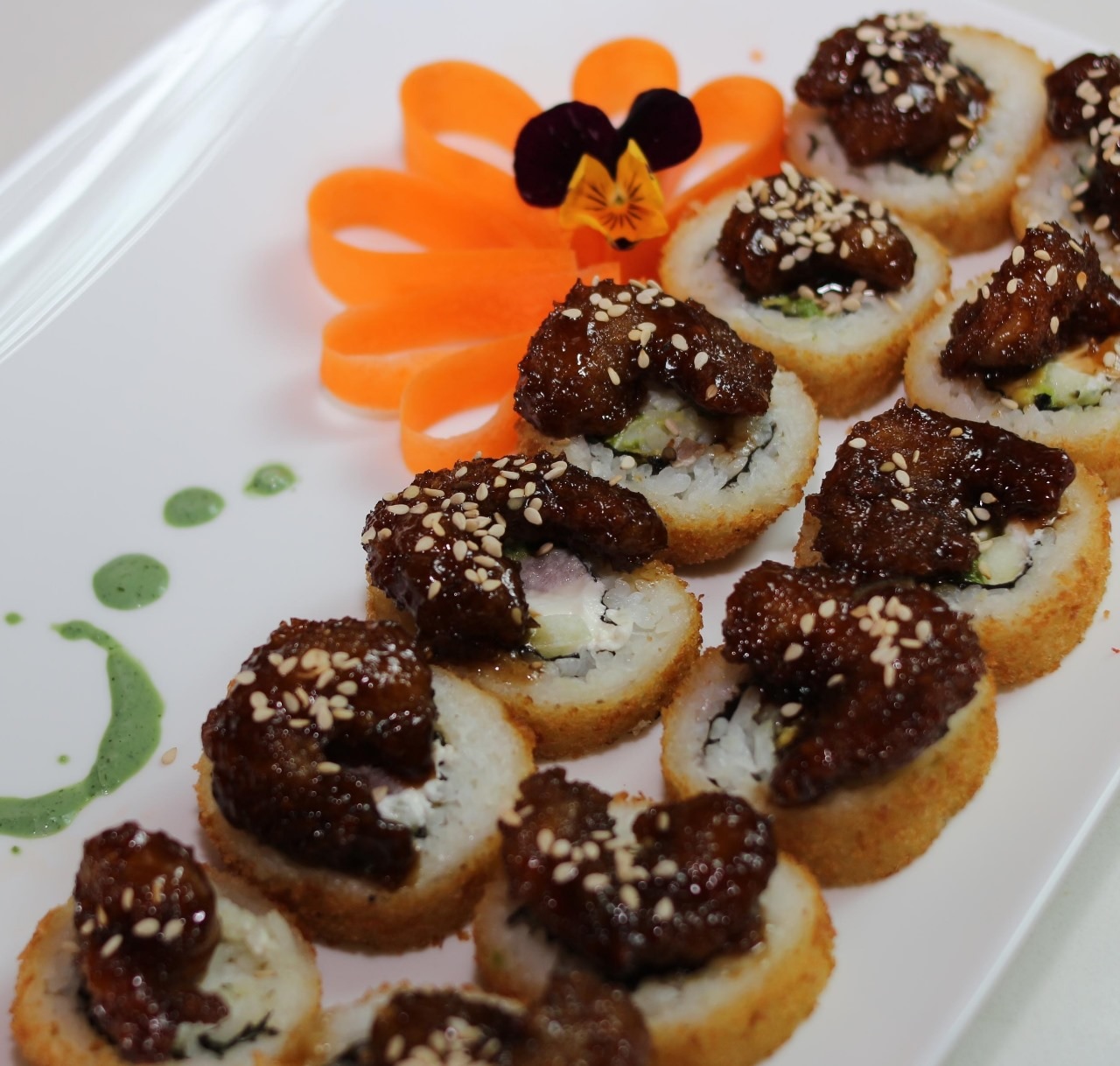 12 pz. Pollo, phila, aguacate y pepino por dentro. Por fuera pollo empanizado y bañado con BBQ.