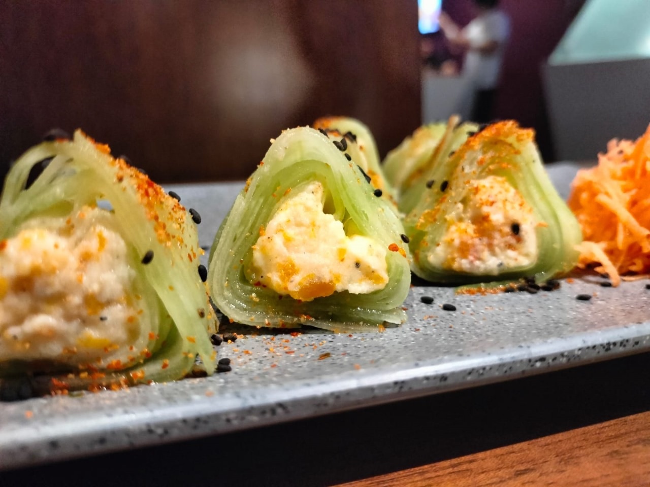 10 pz. Nuestro pure espacial con papa y zanahoria por dentro. Por fuera pepino, togarashi y ajonjolí negro.
