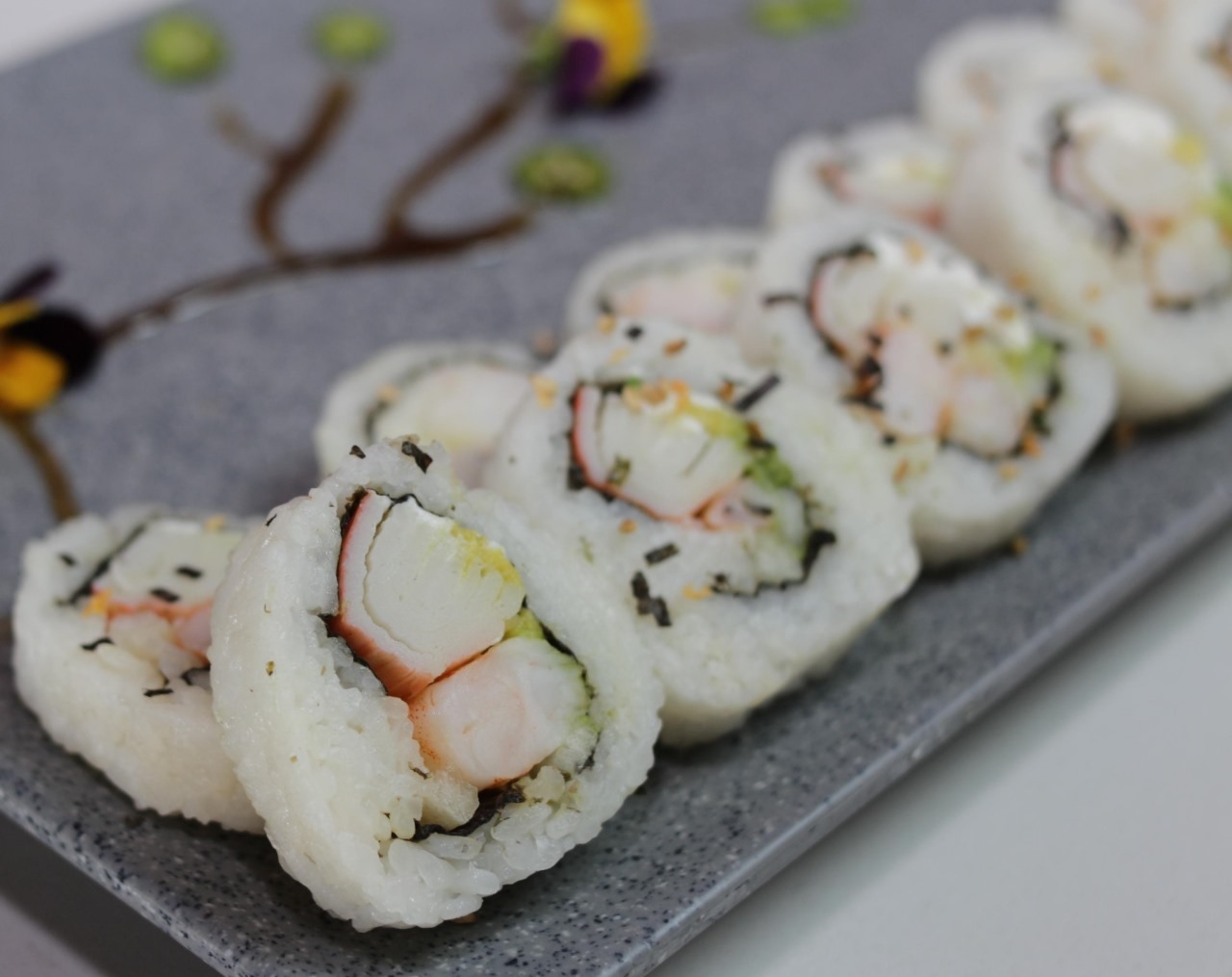 12 pz. Camarón, phila, aguacate, surimi y pepino por dentro. Por fuera salsa de anguila y furikake.