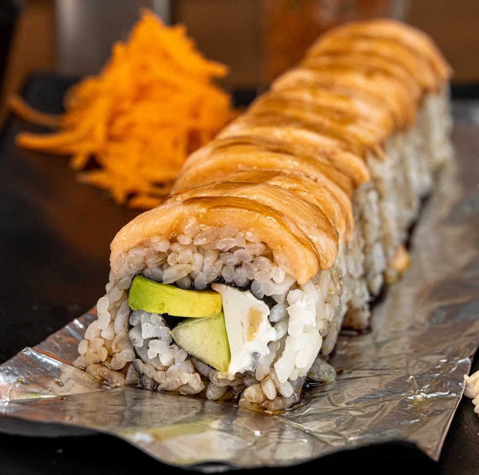 12 pz. Atún, phila, aguacate, surimi y pepino por dentro. Por fuera salmón y salsa de anguila.