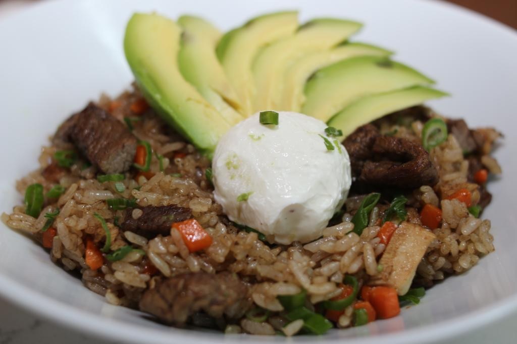 350 Gramos arroz frito con res, pollo y zanahoria. Arriba aguacate, cebolla, cebollín y phila.