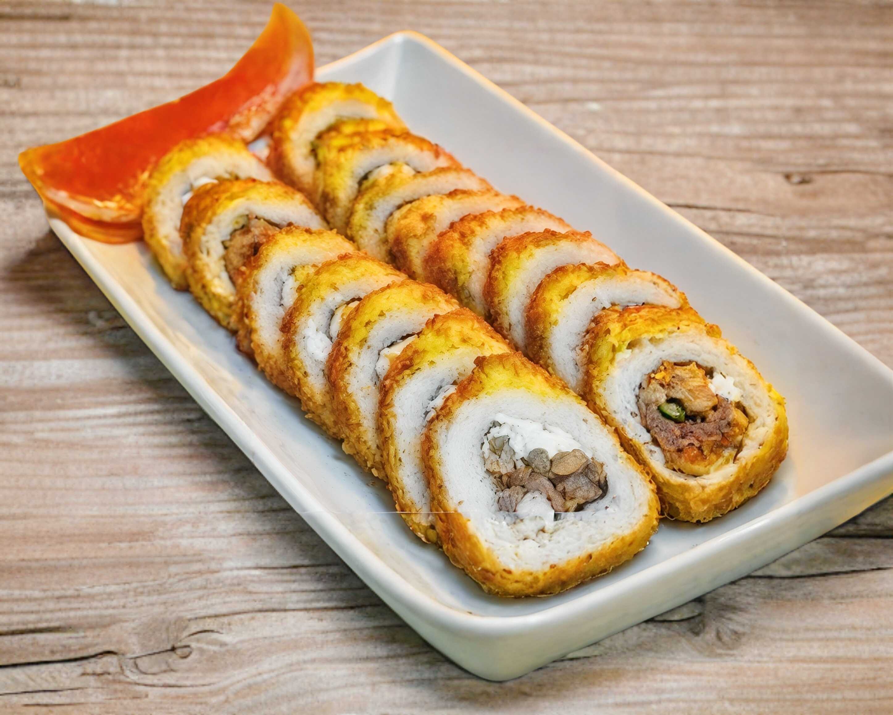 Res,camaron,pollo,philadelphia, aguacate,por fuera un gratinado de spacy con camarones y un chile empanizado