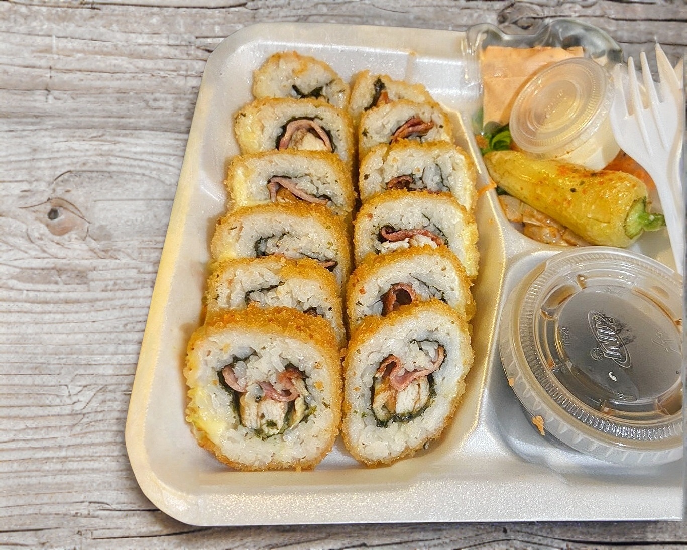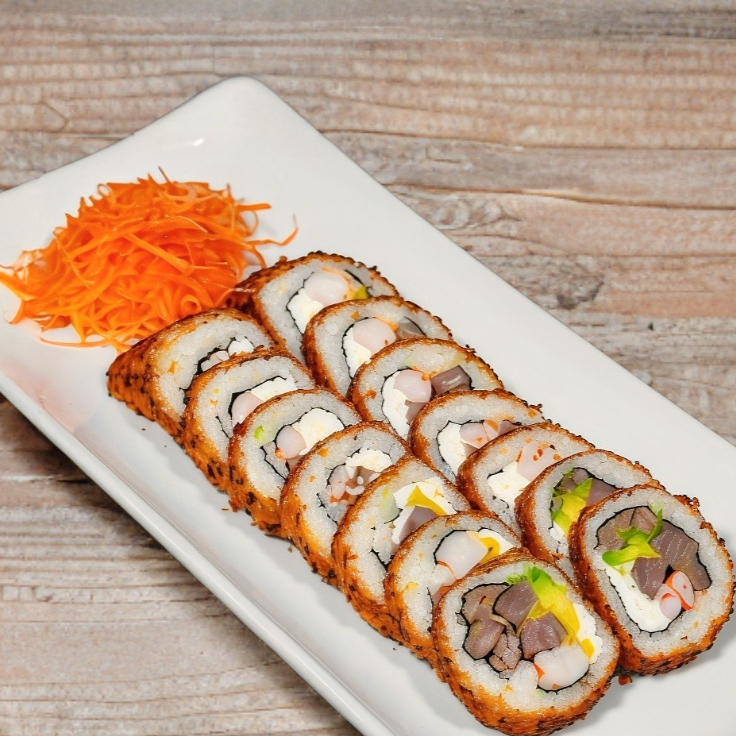 11 rolls de aprox.(200 g). preparado con:Aguacate, alga, res, camarón por fuera queso y philadelphia.
