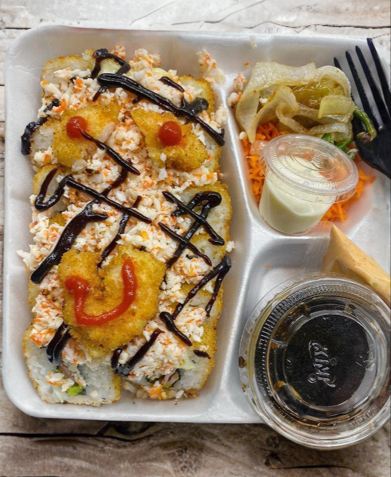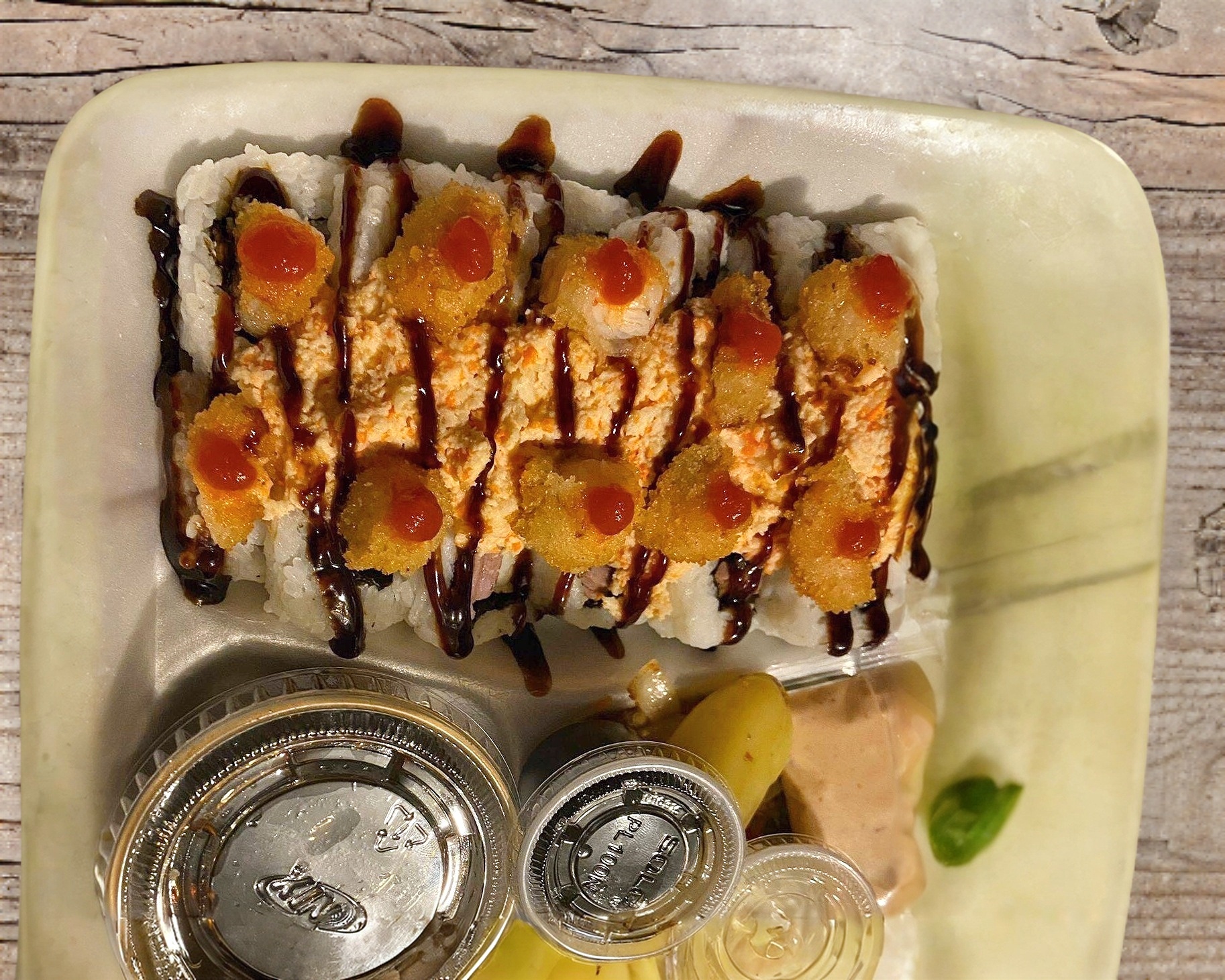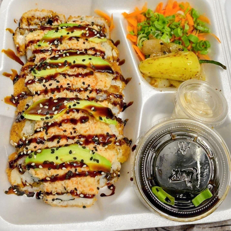 Guamuchilito ( porcion personal )Surimi, pepino, philadelphia, aguacate, por fuera tampico,aguacate,ajonjoli y anguila (250 g), salsa de soya zanahoria cebollin chile caribe mayonesa y chipotle