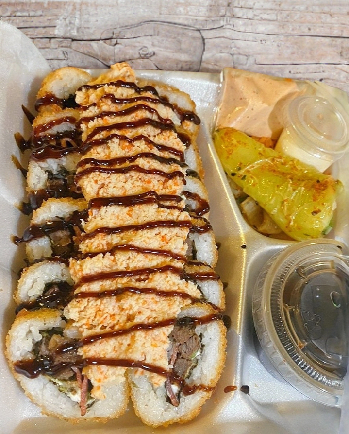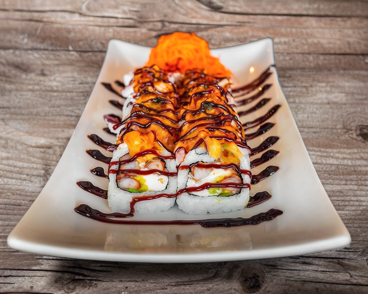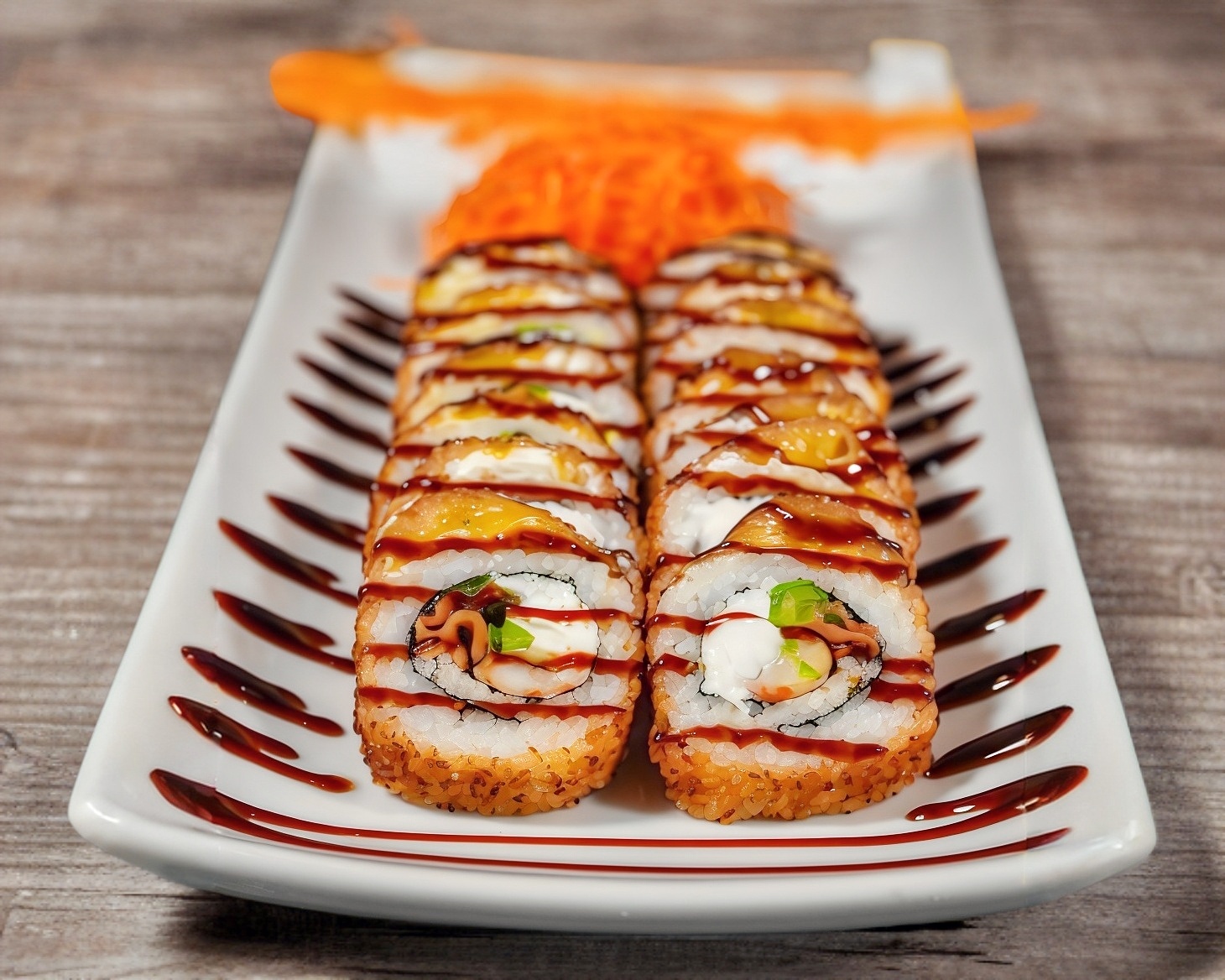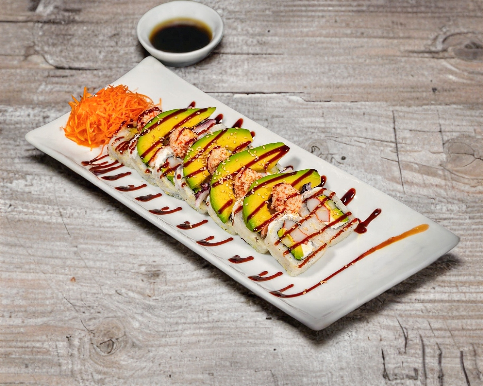 Aguacate, philadelphia, camarón, res por fuera: tampico, camarón empanizado, anguila y sirracha (200 g).