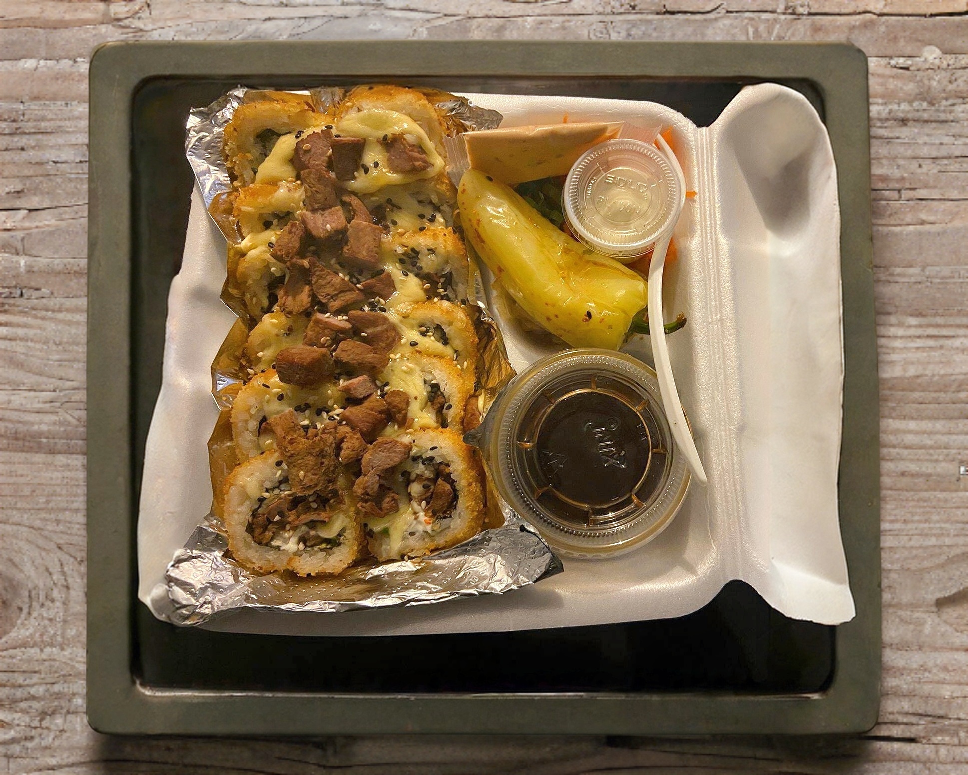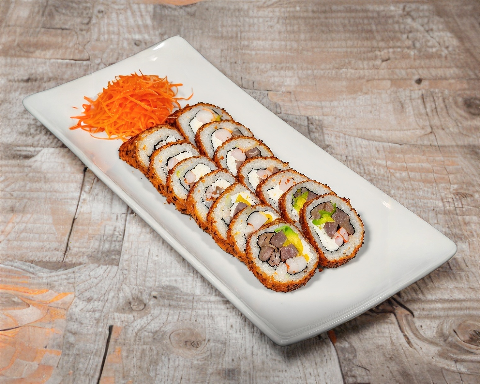 Res, camarón, philadelphia, aguacate, por fuera: queso y res con anguila y ajonjolí (250 g).
