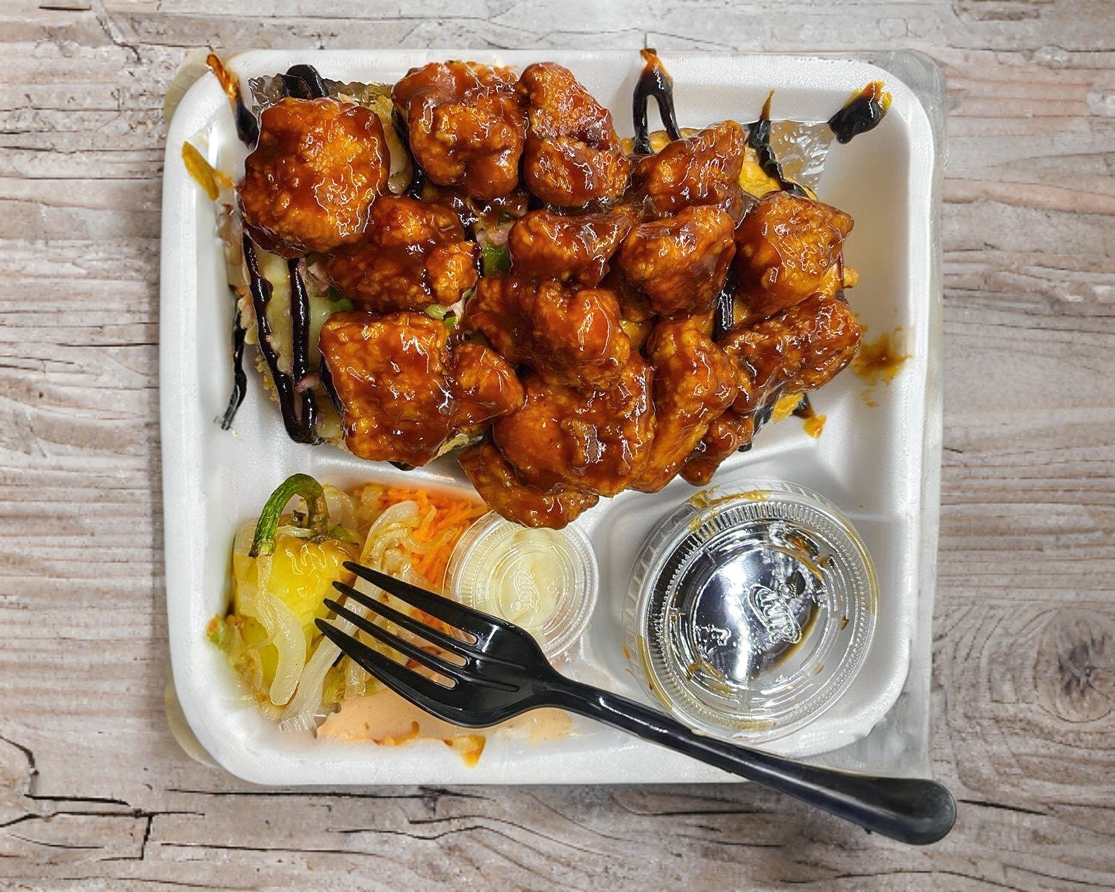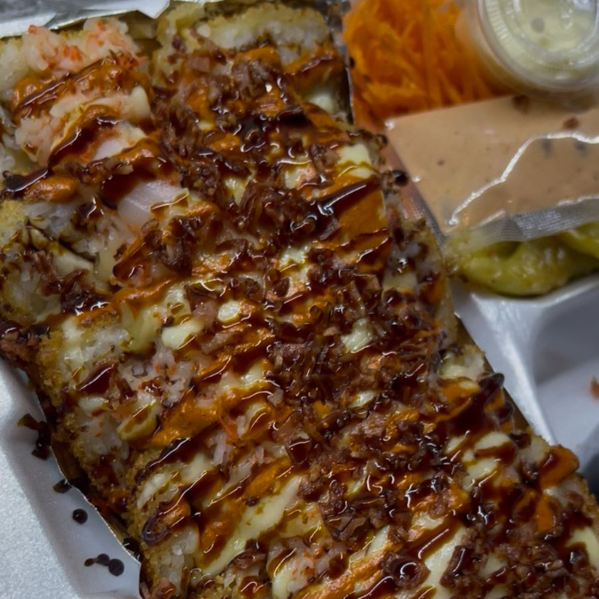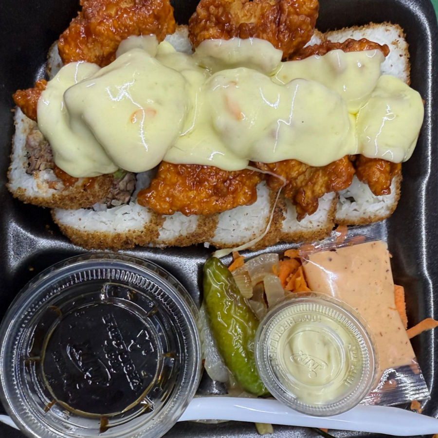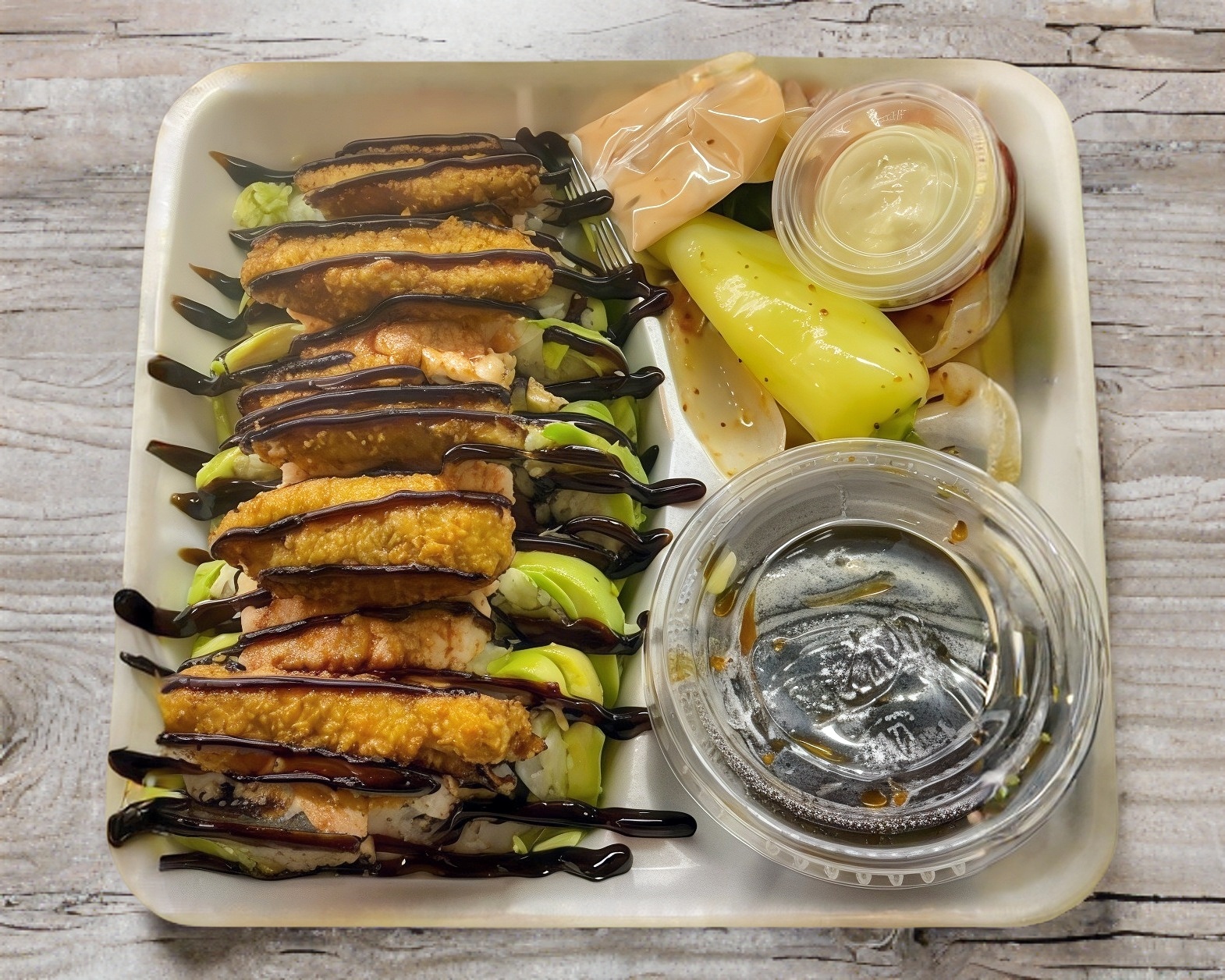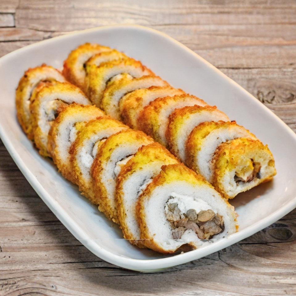 pollo,tocino,philadelphia,aguacate por fuera queso gratinado tampico camaron empanizado sirracha y anguila 250 g