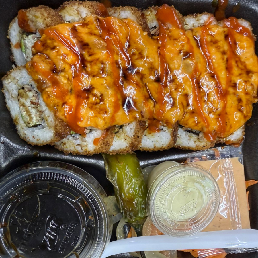 Un platillo persona de volcan, Aprox. (250 g). Preparado: Aguacate, philadelphia, pollo, tocino, por fuera res camaron pollo con un spacy por encima anguila y sirracha