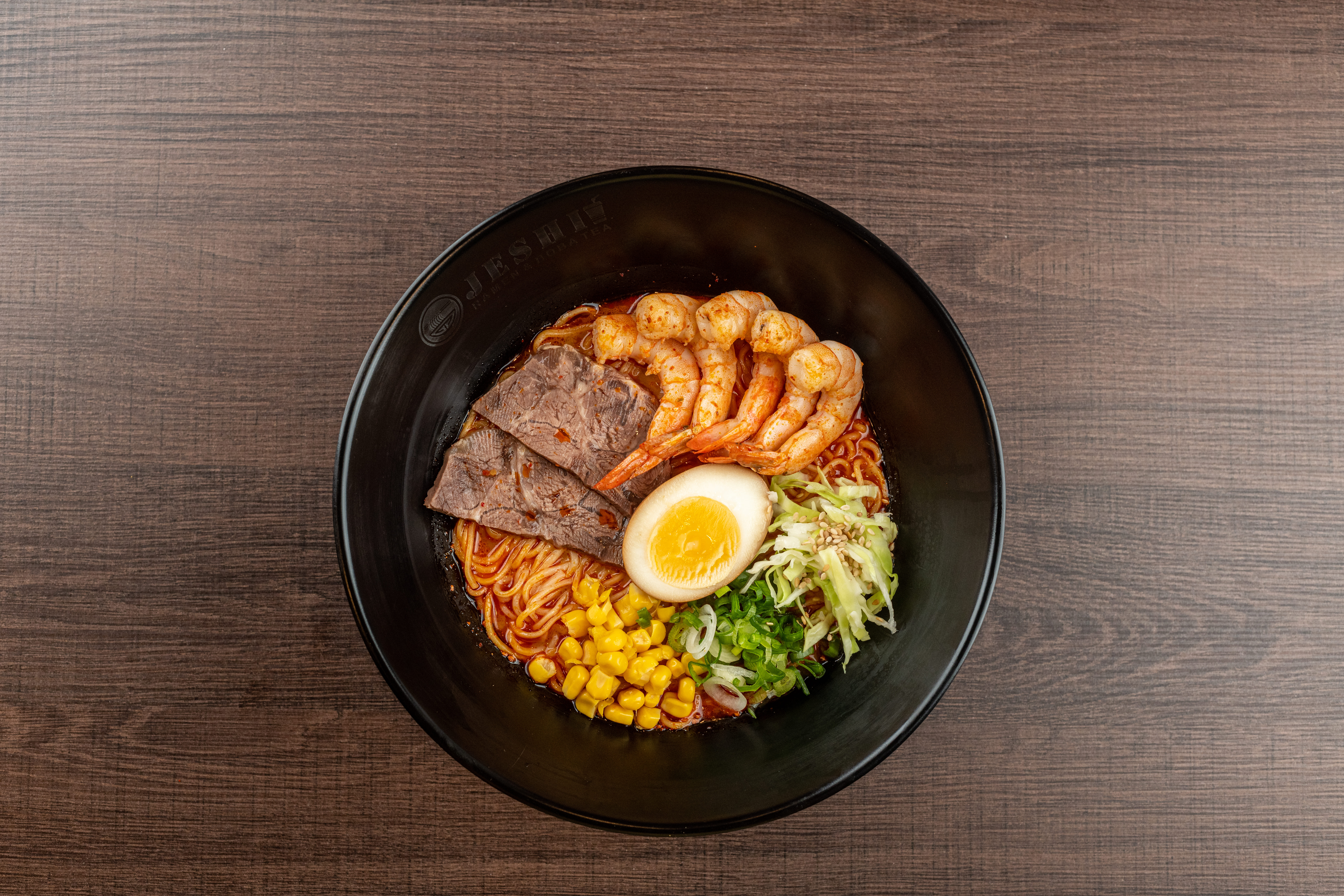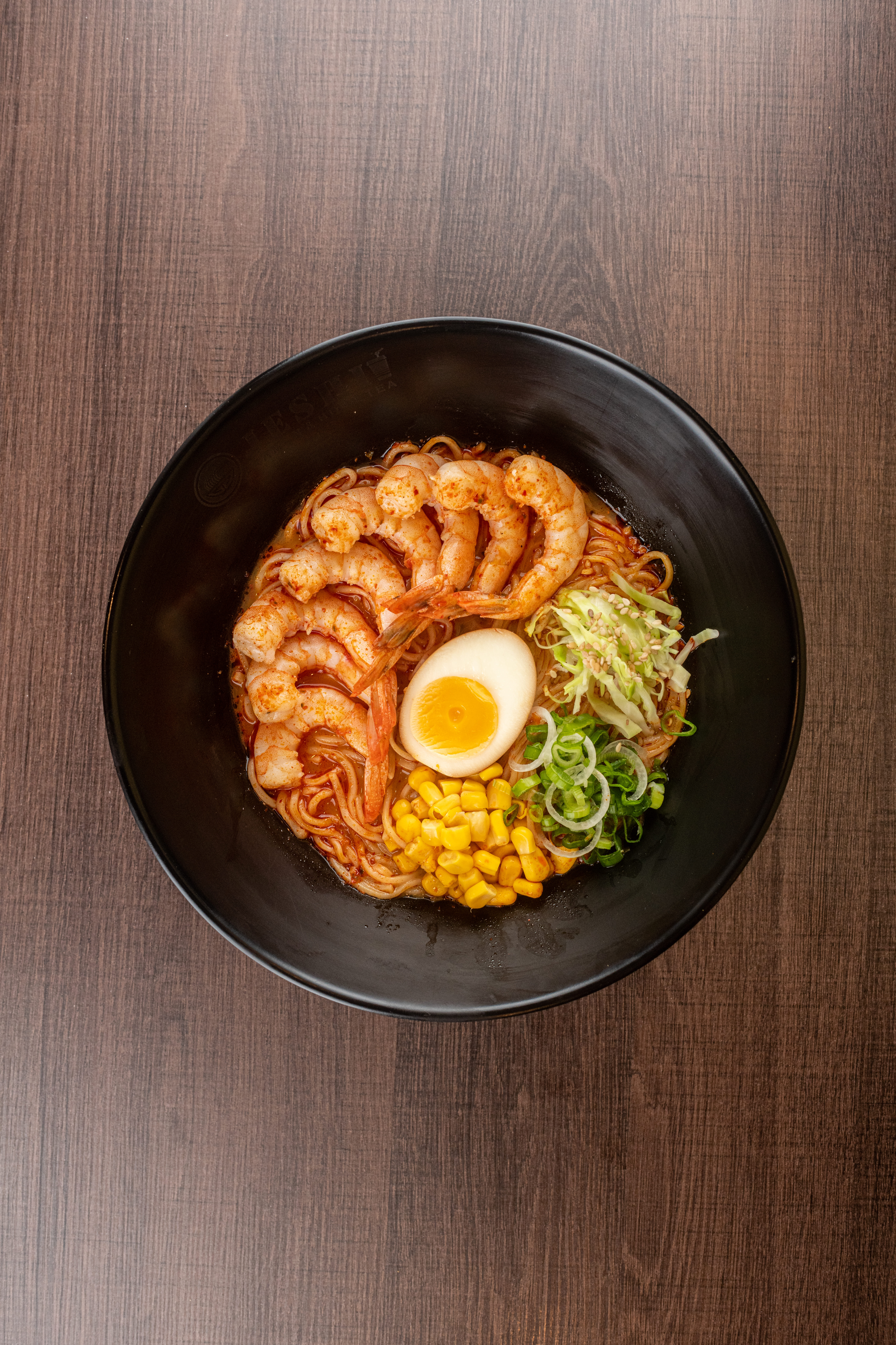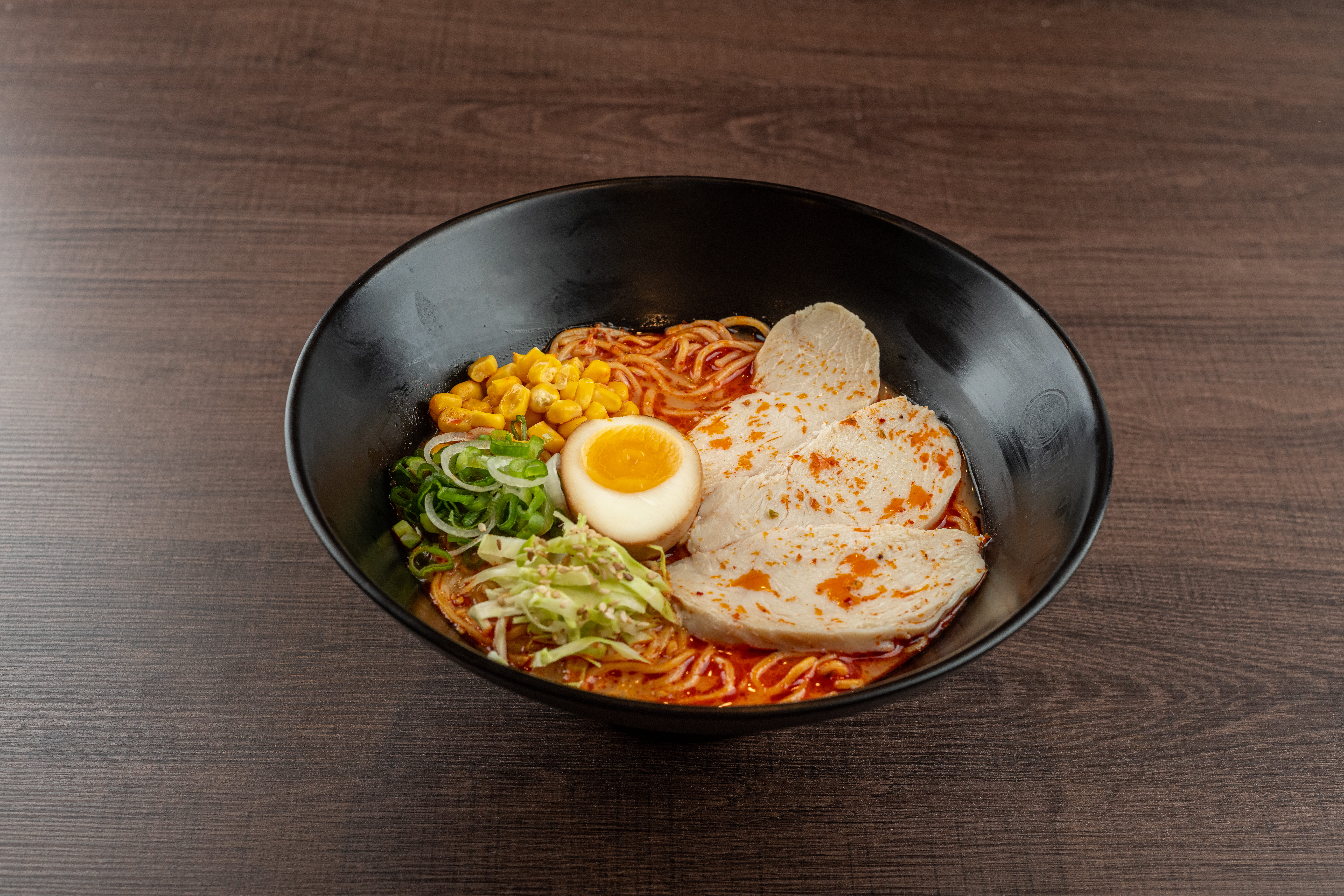 Caldo condimentado a base de chiles y especies con rebanadas de lomo de cerdo marinado, narutomaki, doble huevo, col, elote, cebollín y alga nori.