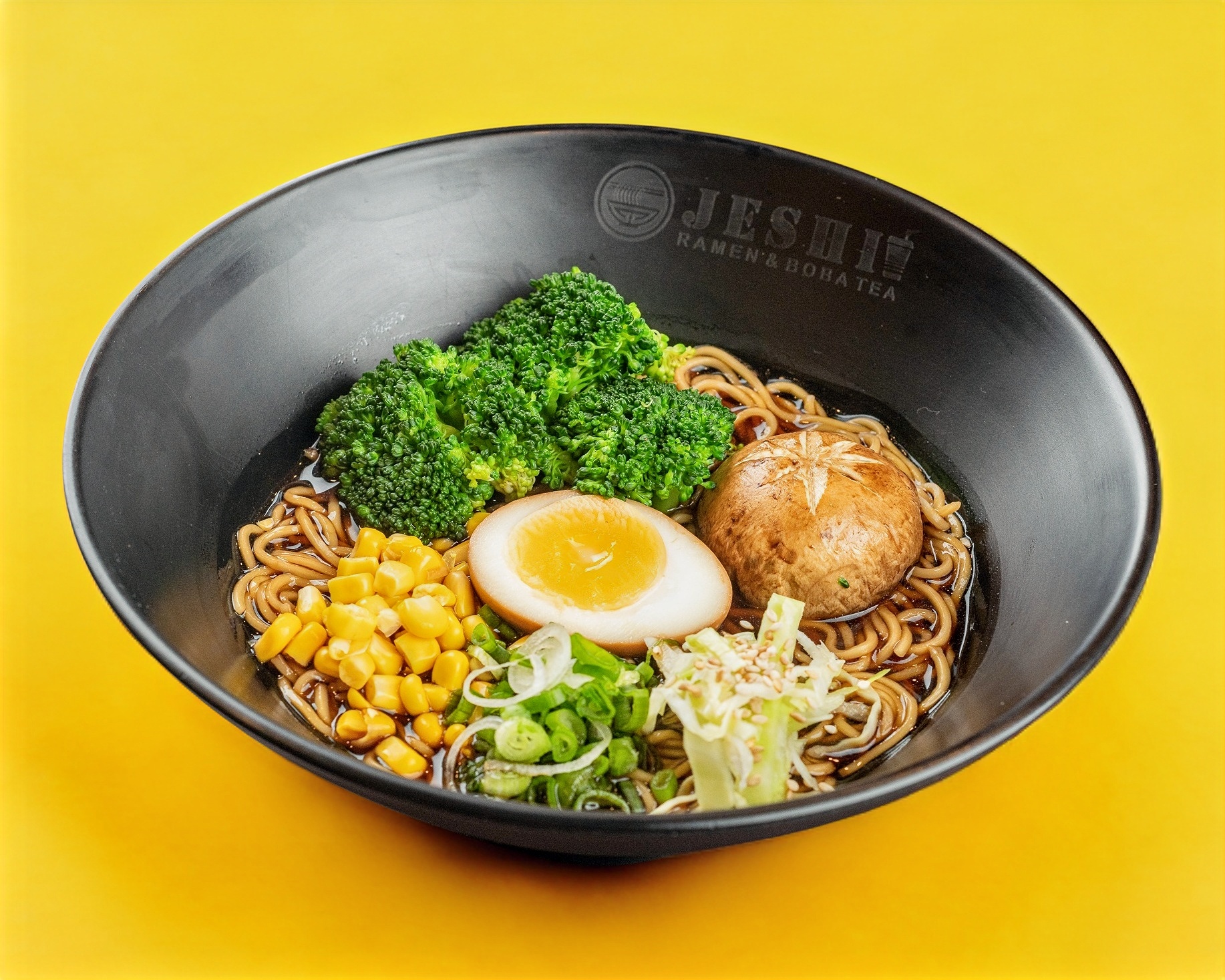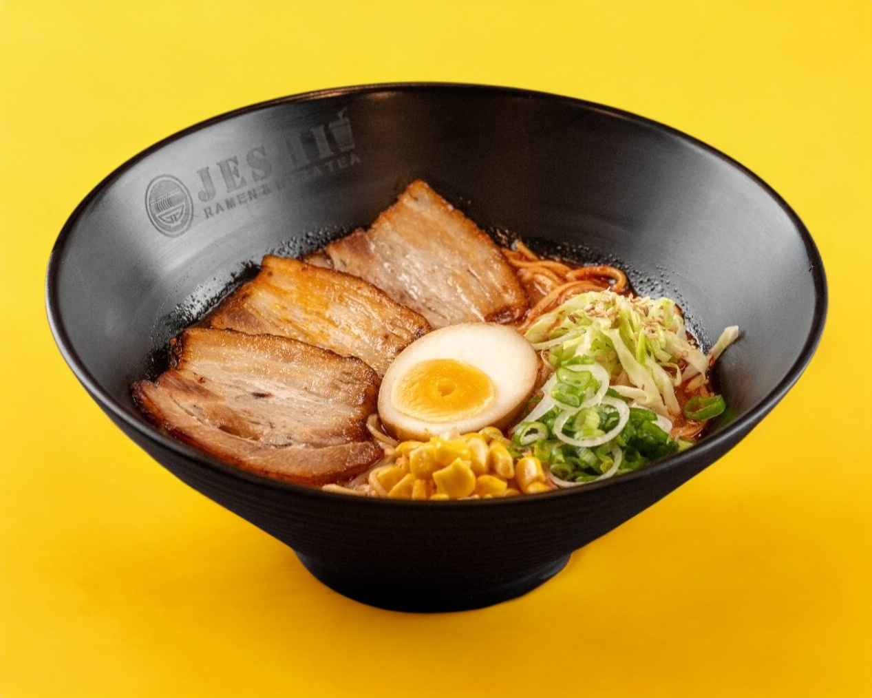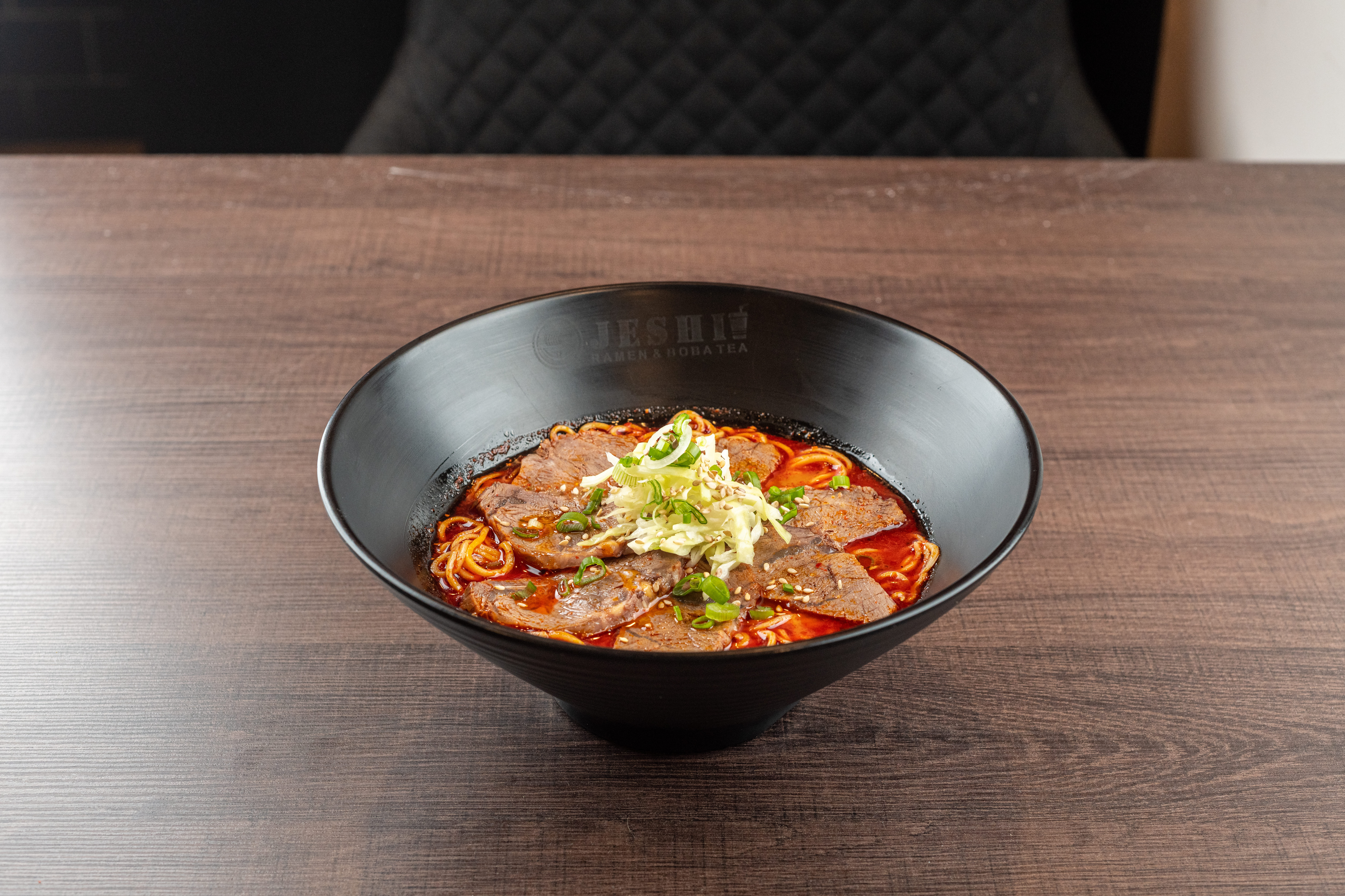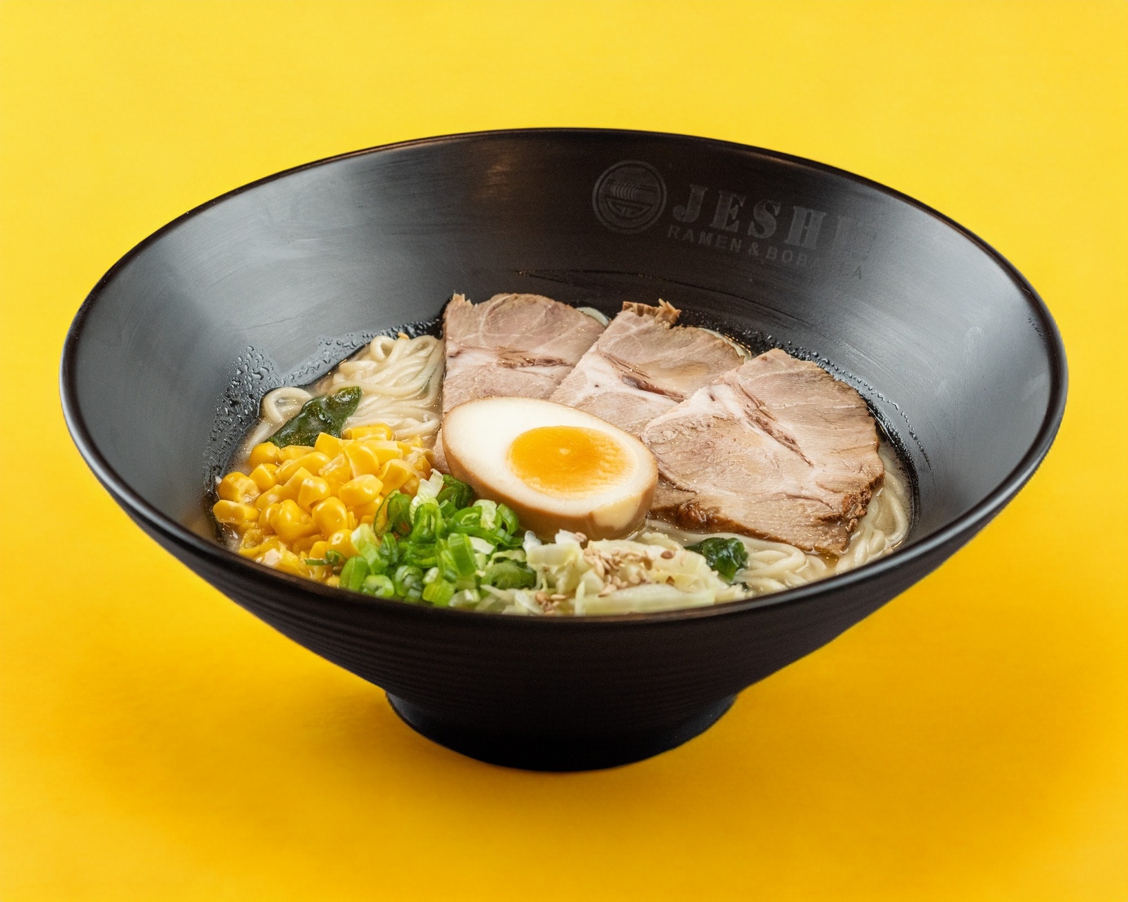 Caldo condimentado a base de chiles y especies con rebanadas de lomo de cerdo marinado, narutomaki, doble huevo, col, elote, cebollín y alga nori.