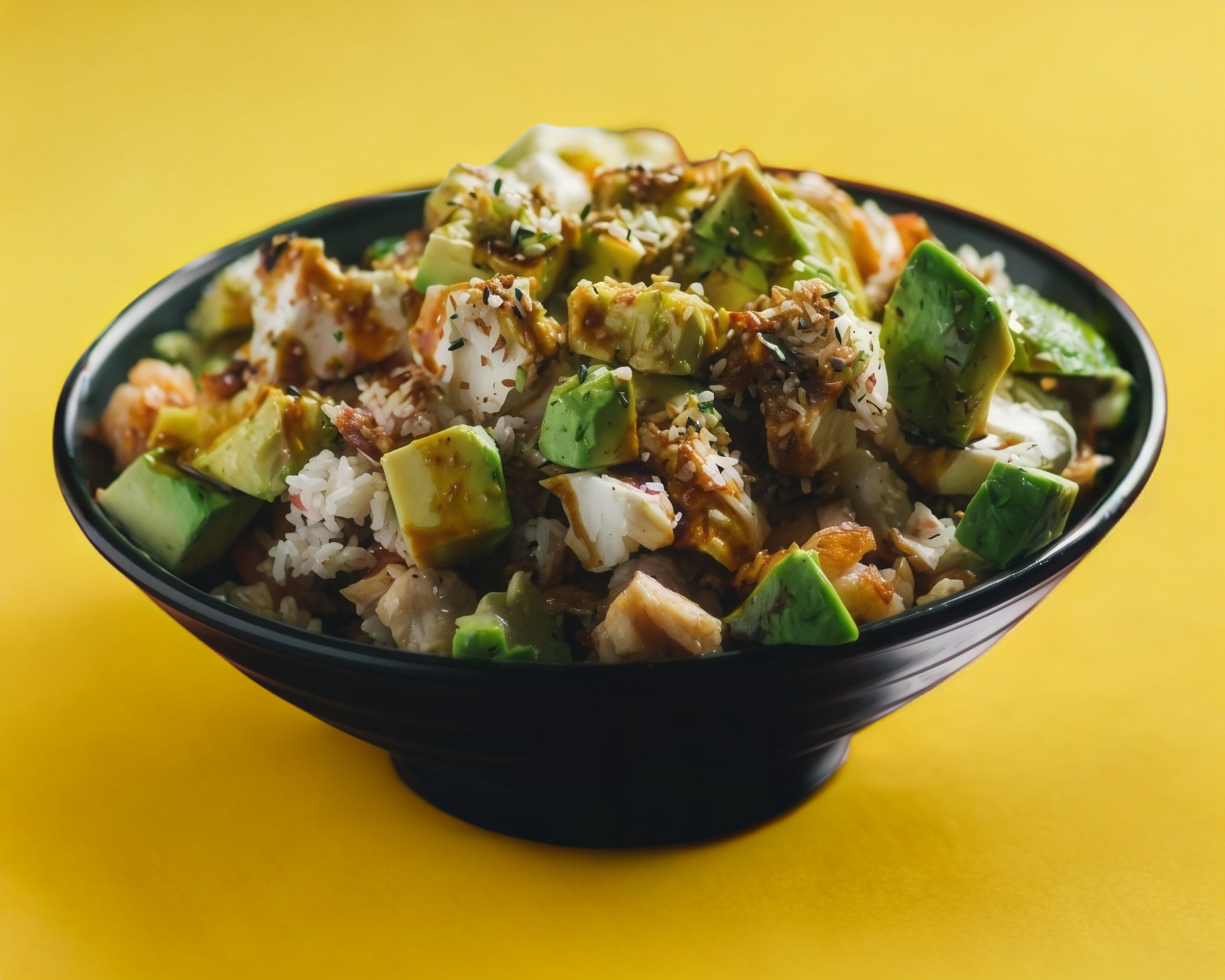 ARROS FRITO A BASE DE SOYA ORIENTAL, COMBINACION DE CAMARON, RES Y POLLO. TAMPICO, AGUACATE Y SALSA DE ANGUILA
