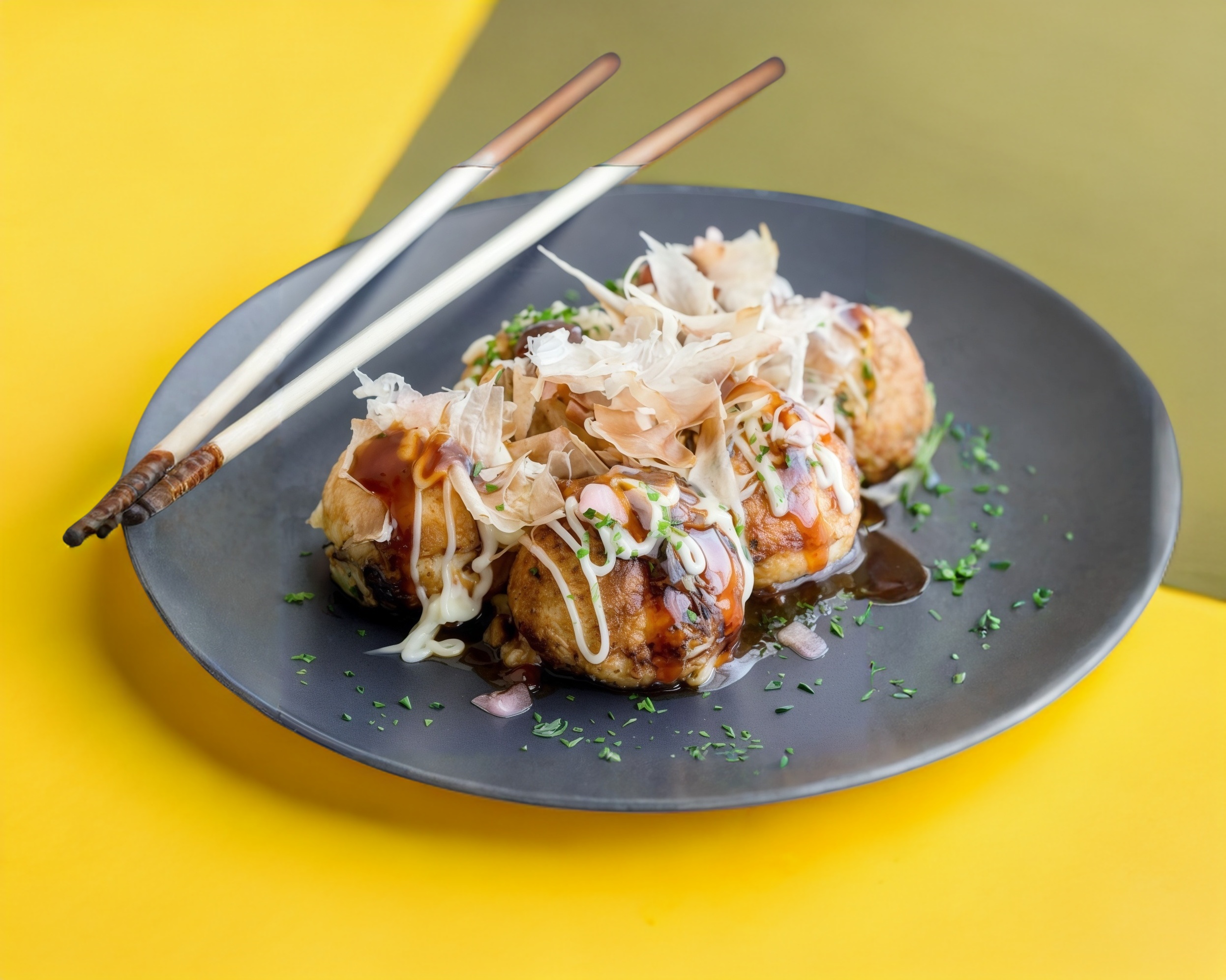 relleno de pulpo queso y cangrajo bañados en mayonesa japonesa y salsa takaoyaki, alga y hojas de pescado