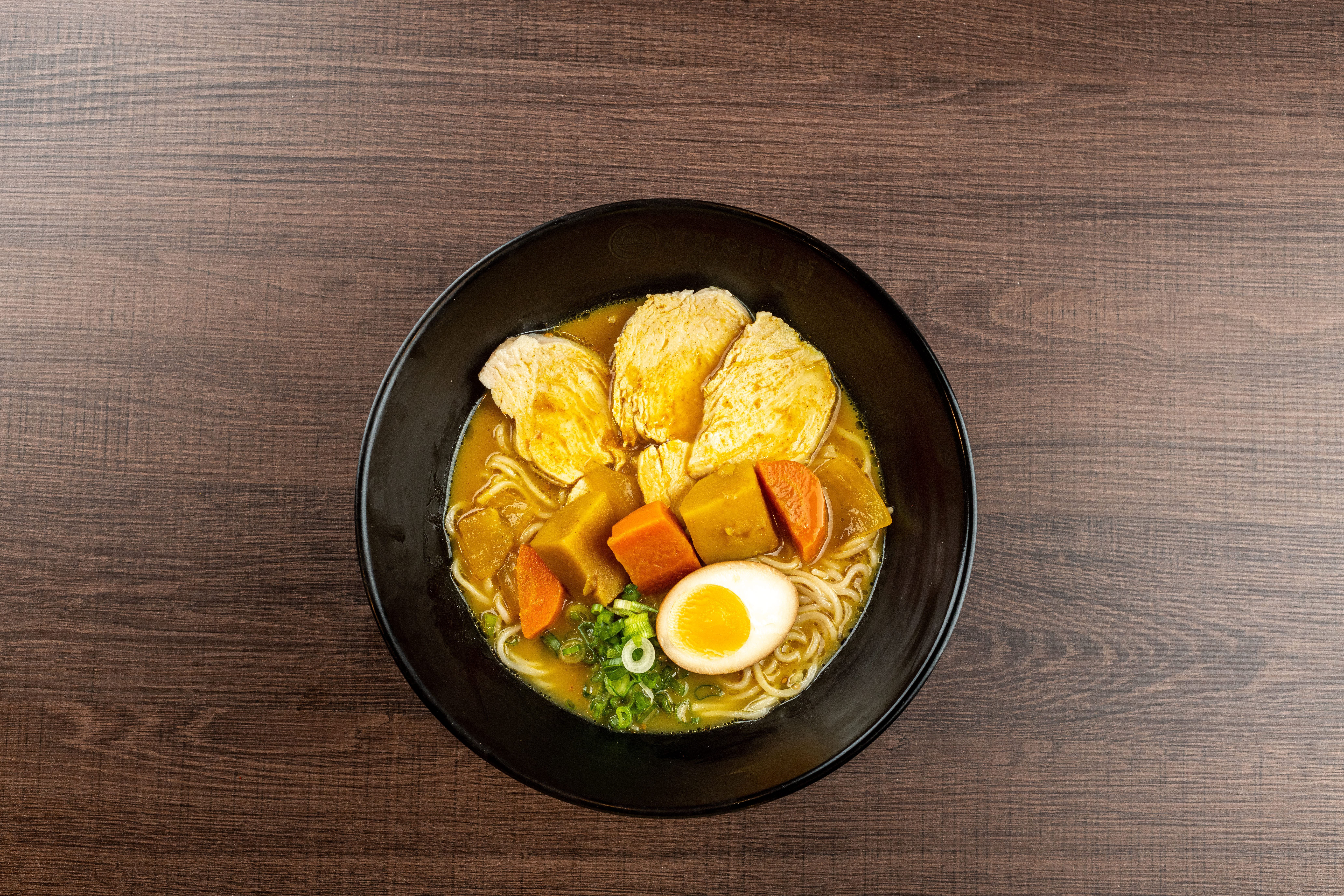 Caldo con base de curry amarillo con suaves rebanadas de pechuga de pollo al vapor, huevo, papa, zanahoria y cebollín.