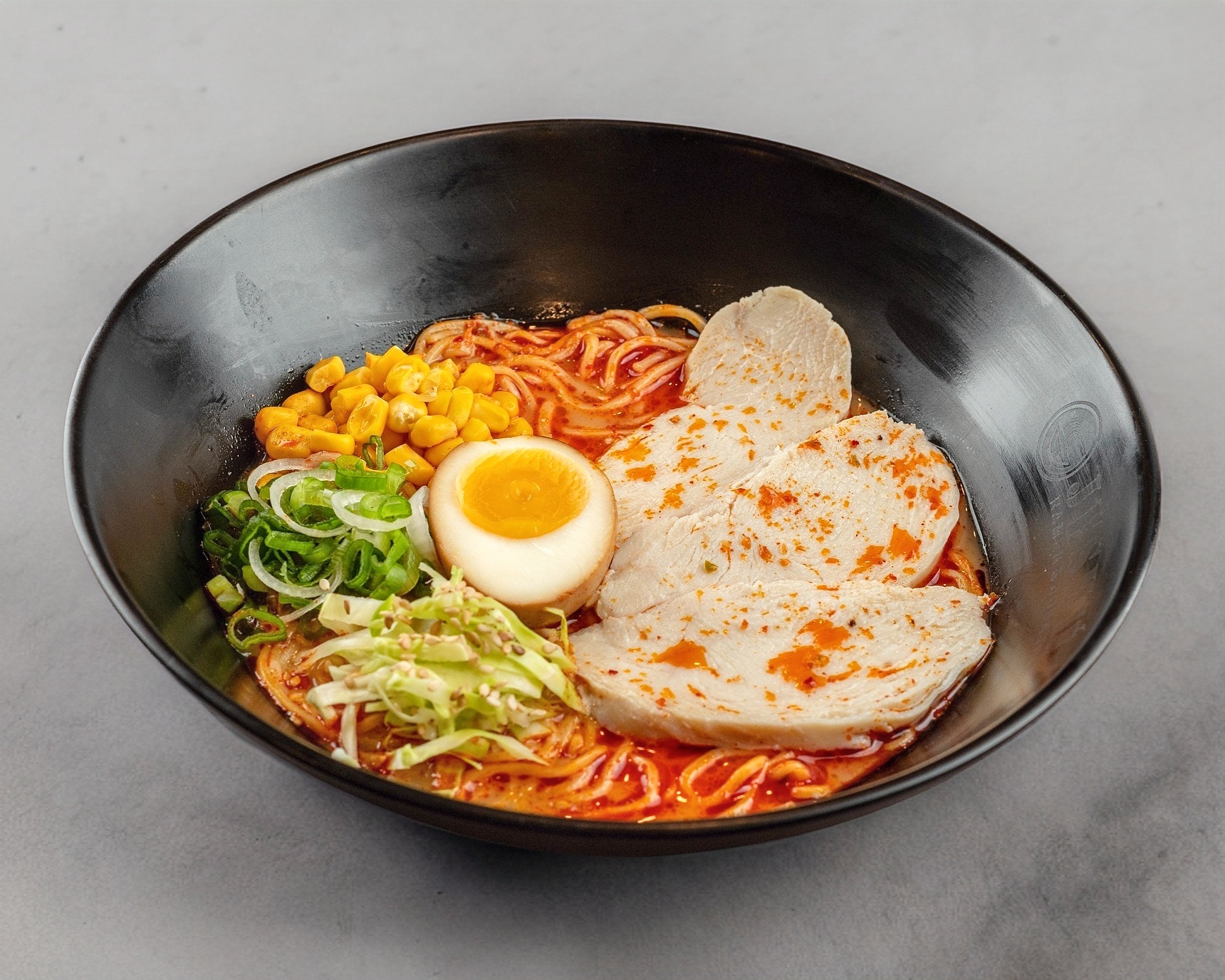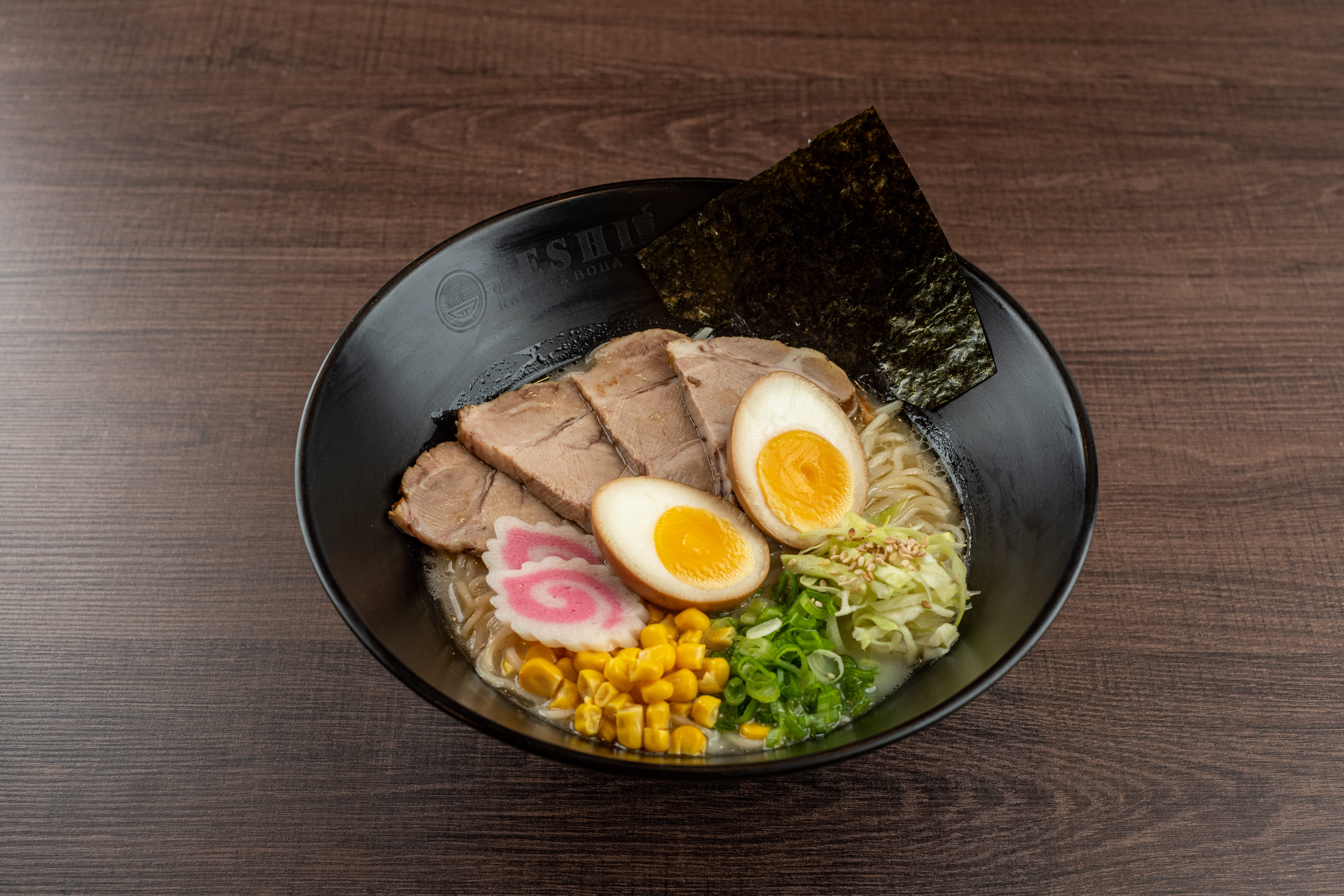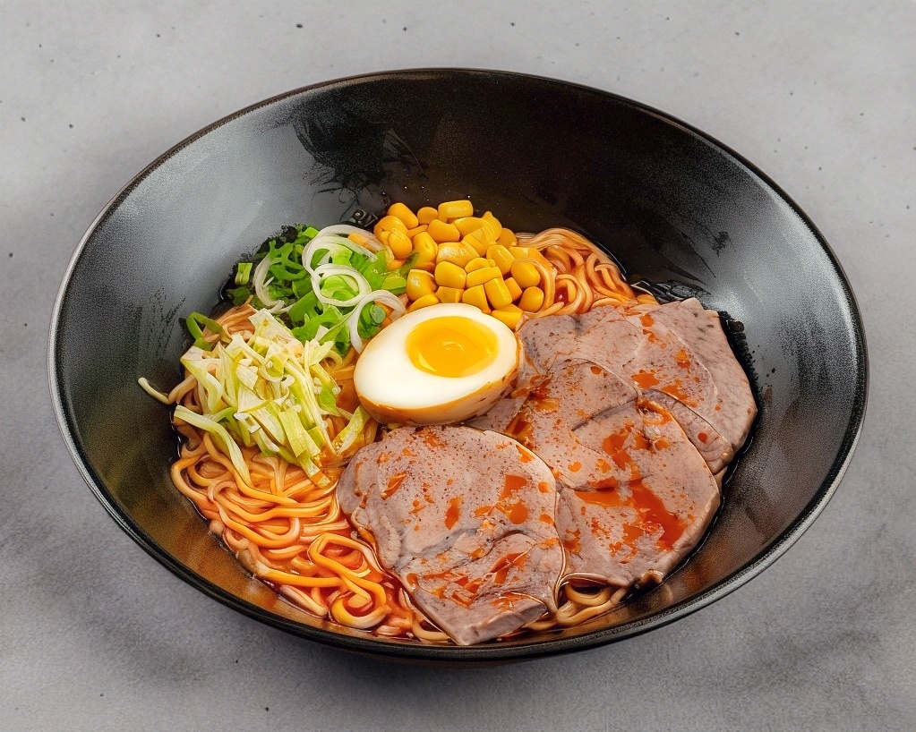 Caldo condimentado a base de chiles y especies con rebanadas de lomo de cerdo marinado, narutomaki, doble huevo, col, elote, cebollín y alga nori.