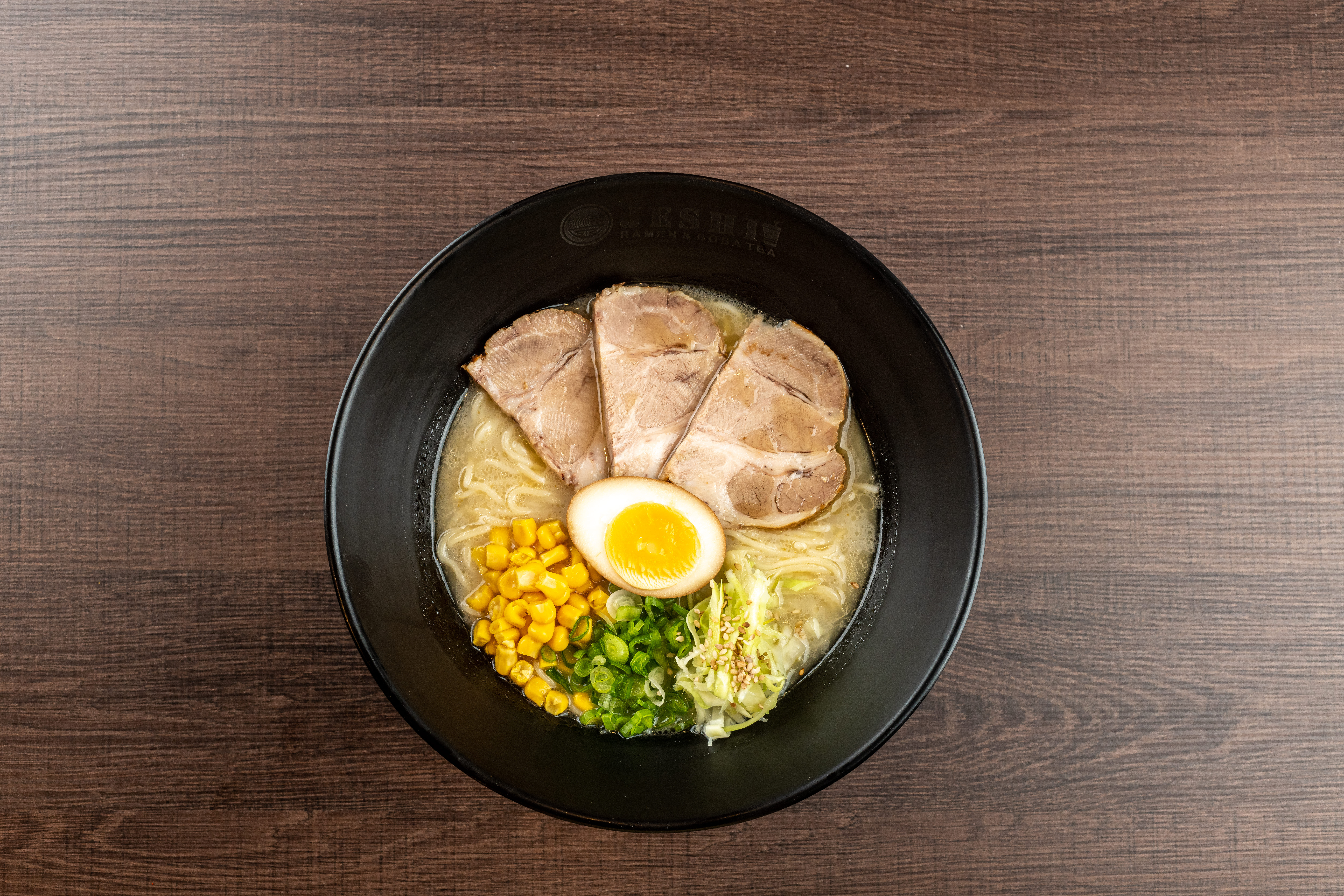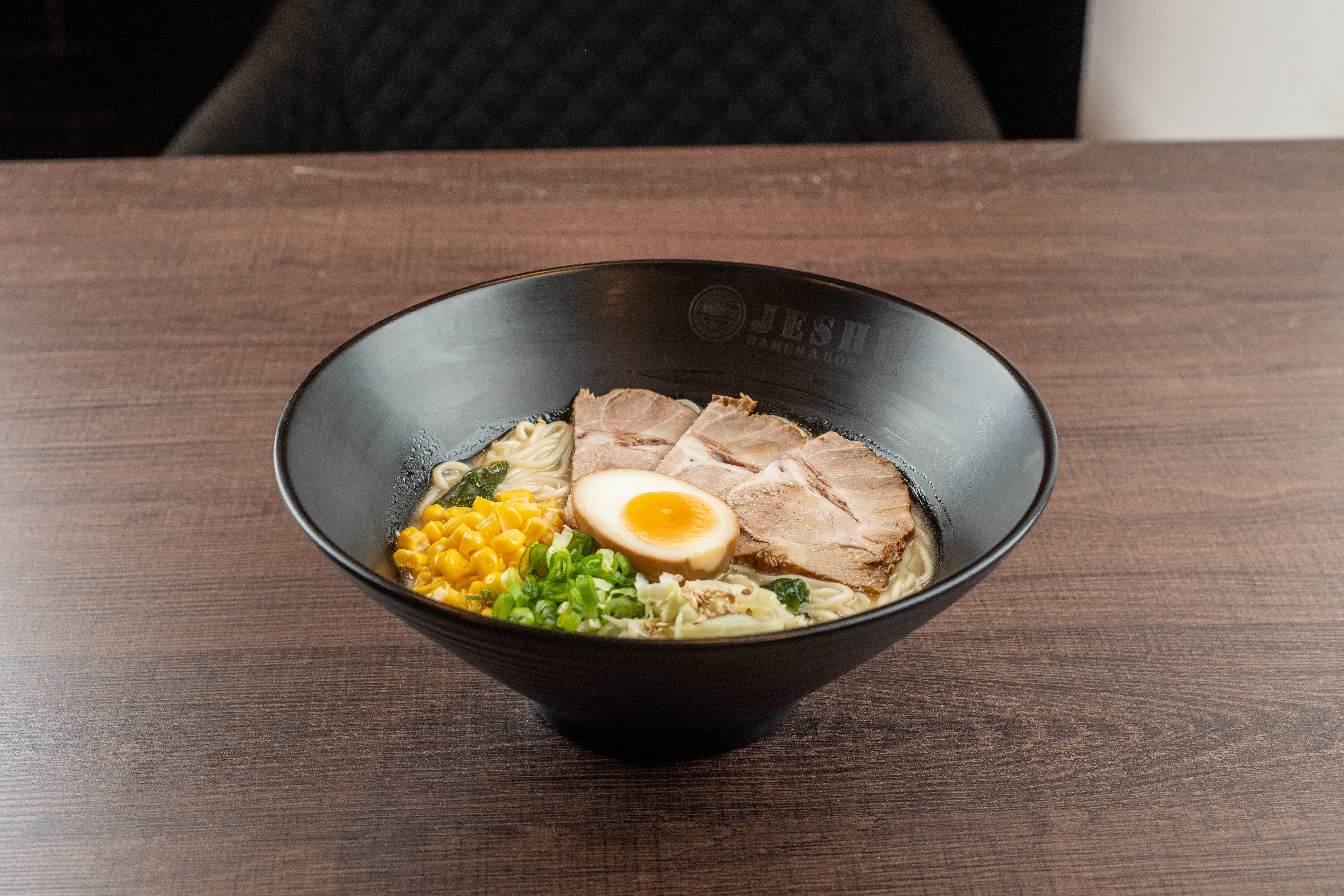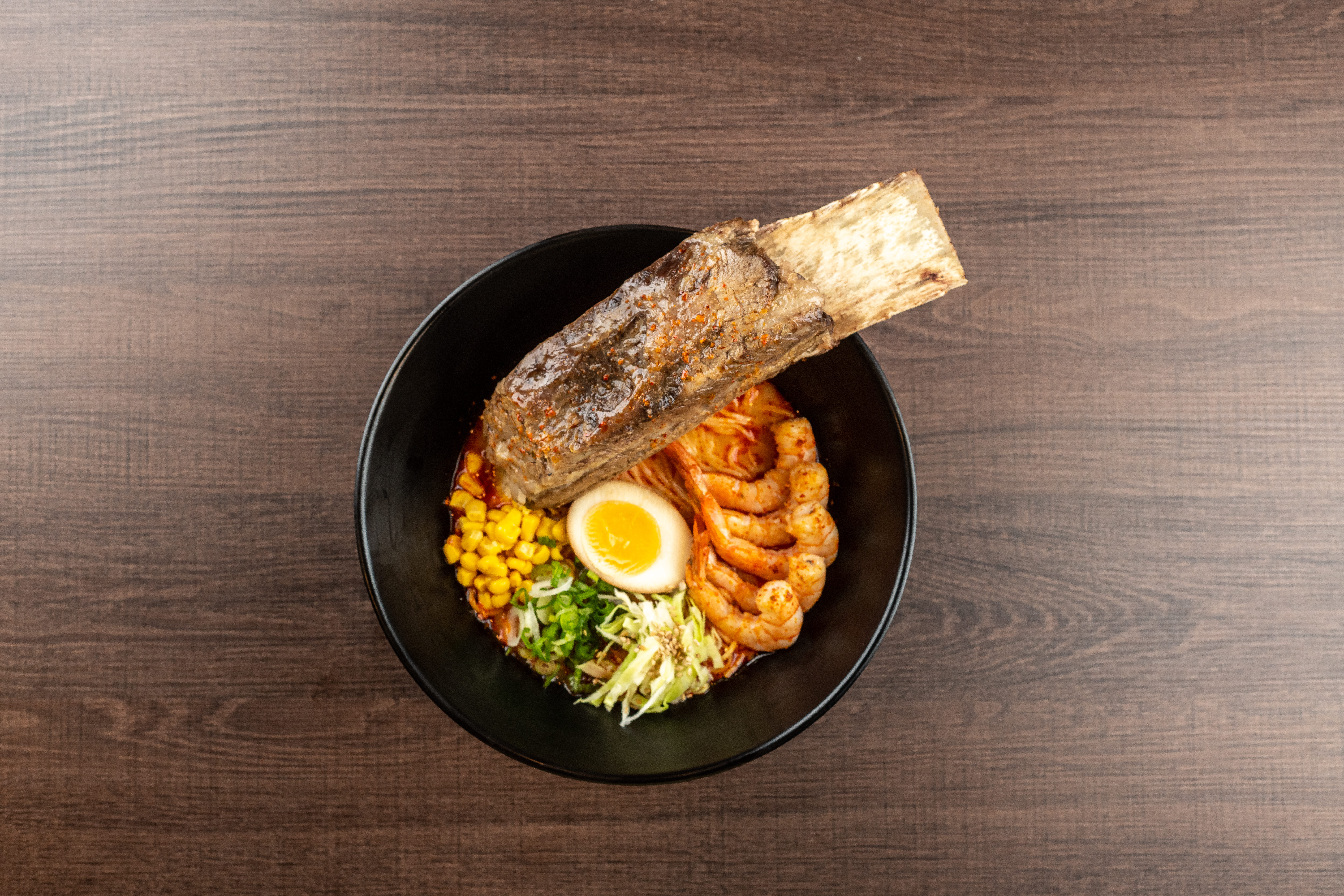Caldo condimentado a base de chiles y especies con rebanadas de lomo de cerdo marinado, narutomaki, doble huevo, col, elote, cebollín y alga nori.