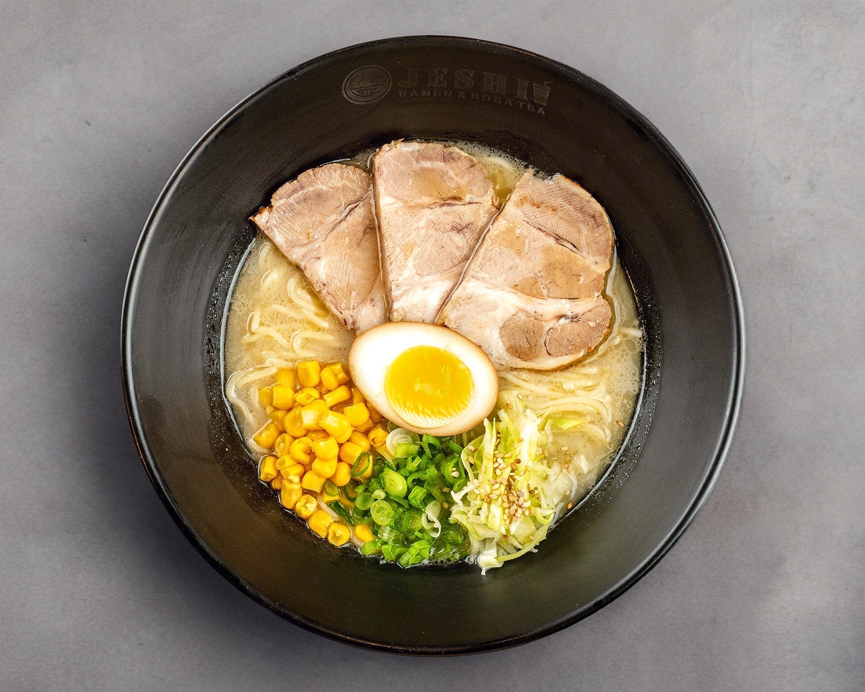 Rebanadas de lomo de cerdo marinado, narutomaki, doble huevo, col, elote, cebollín y alga nori.