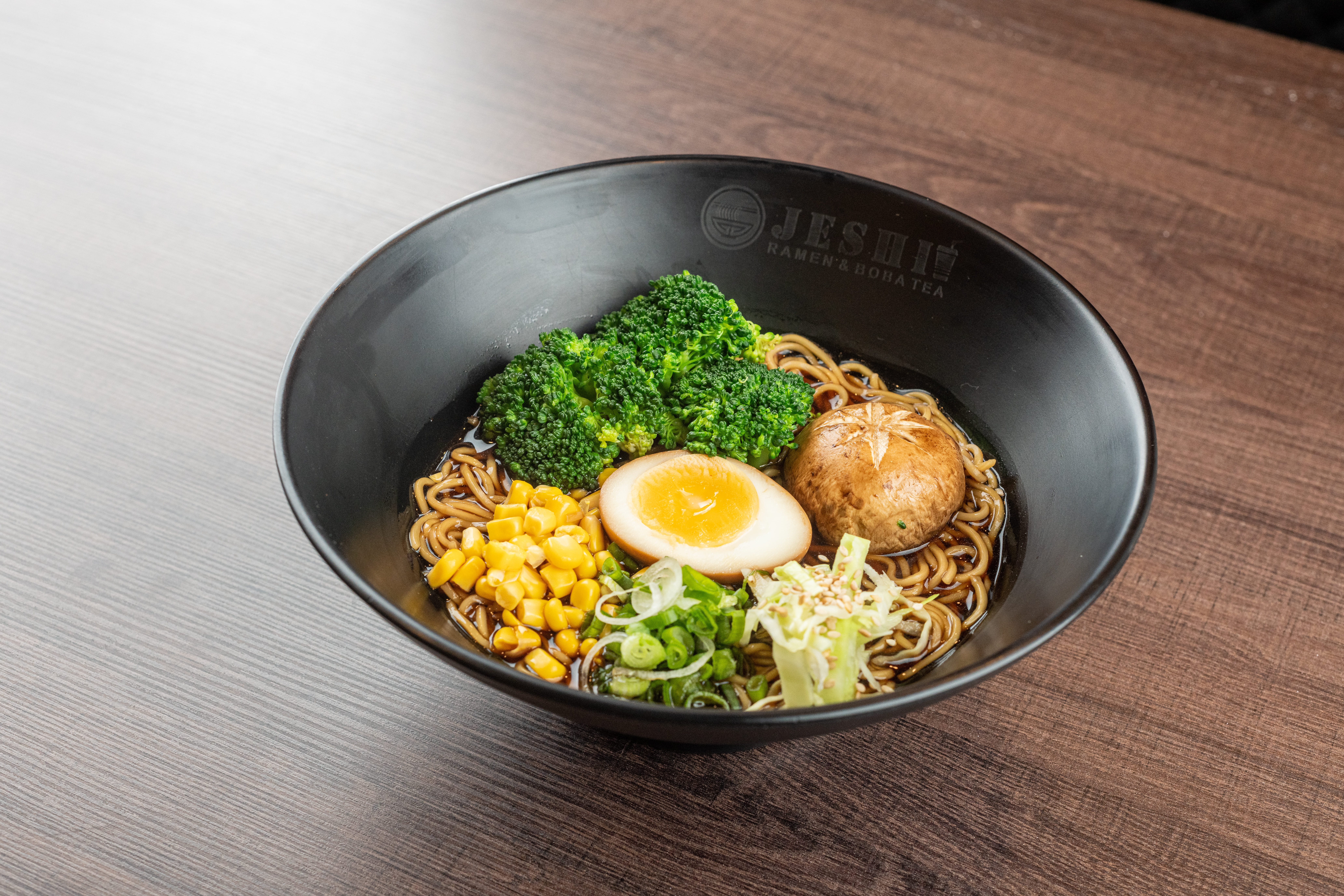 Caldo a base de soya preparada con brócoli, champiñón, col, elote, huevo y cebollín.