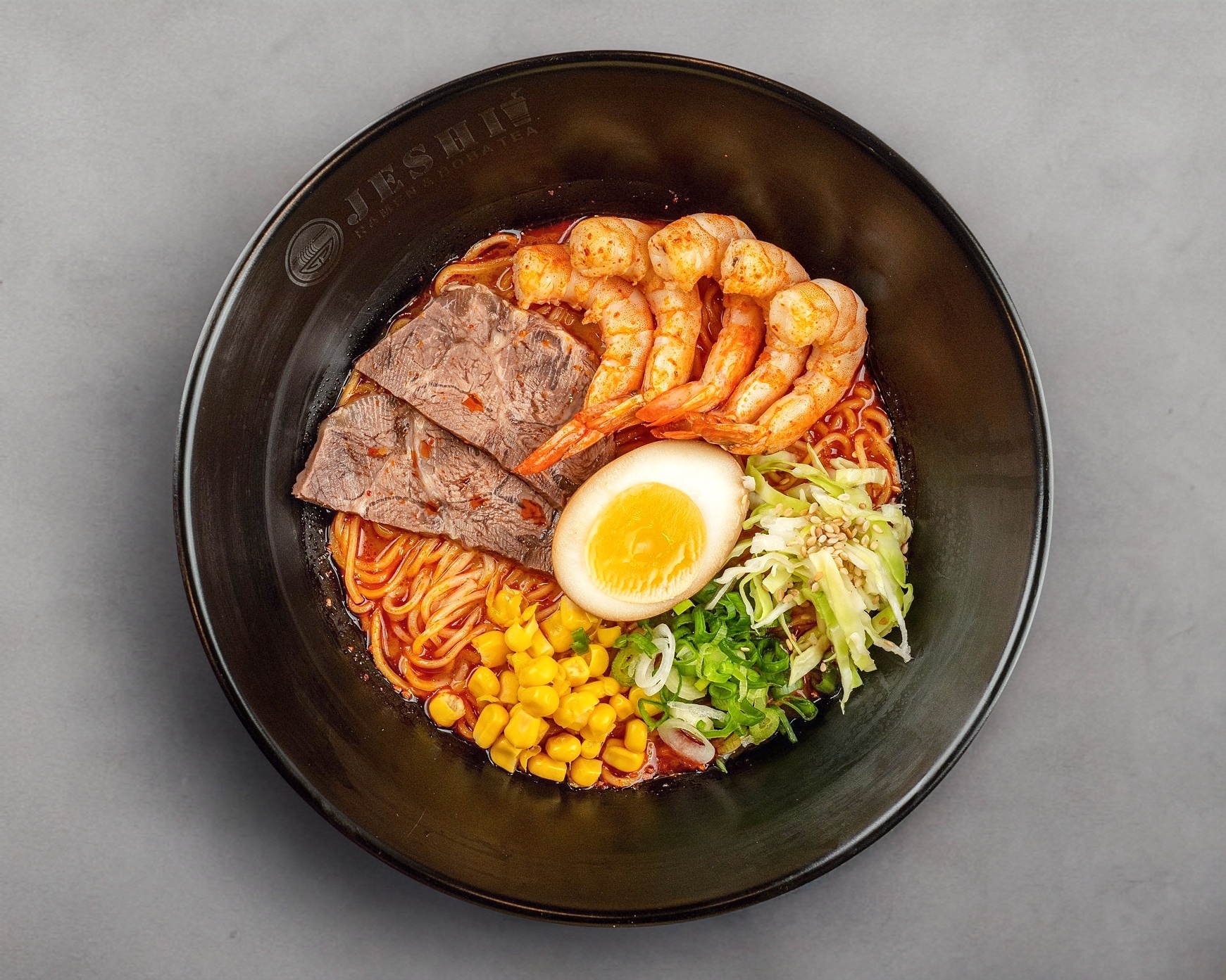 Con ricas rebanadas de res y camarones, huevo, col, elote y cebollín.