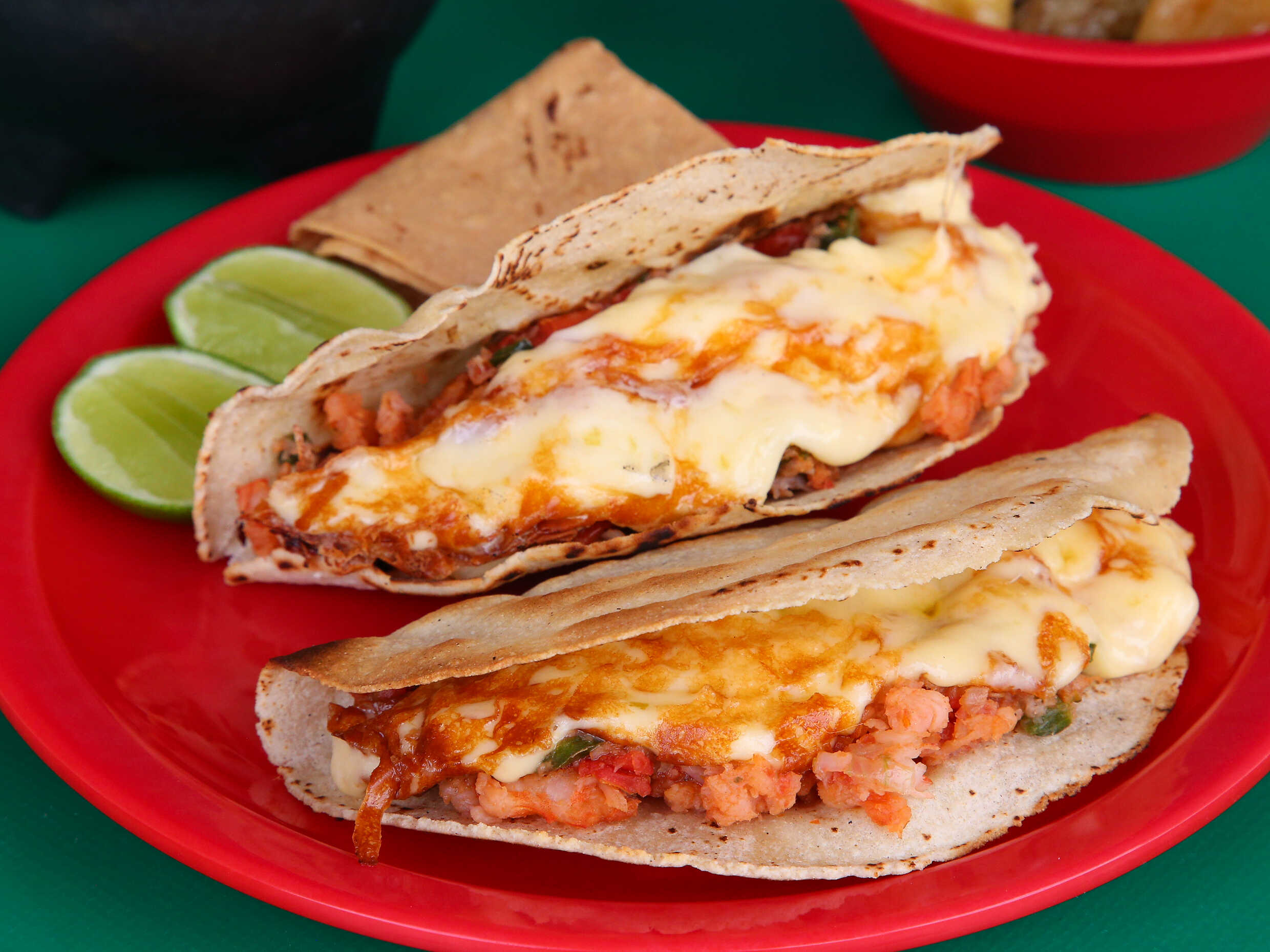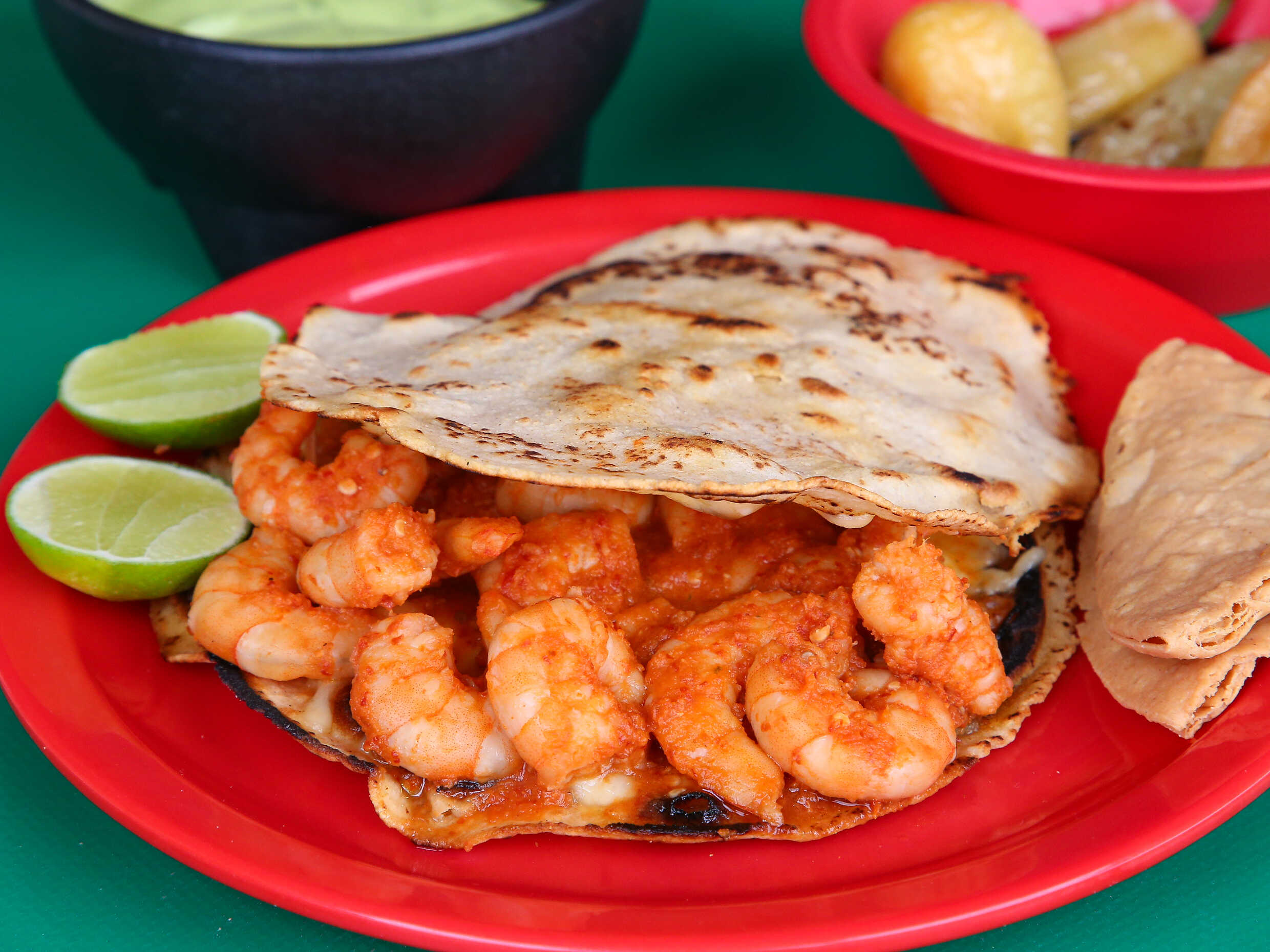 Quesadilla de maíz doble rellena de camarón enchilado.