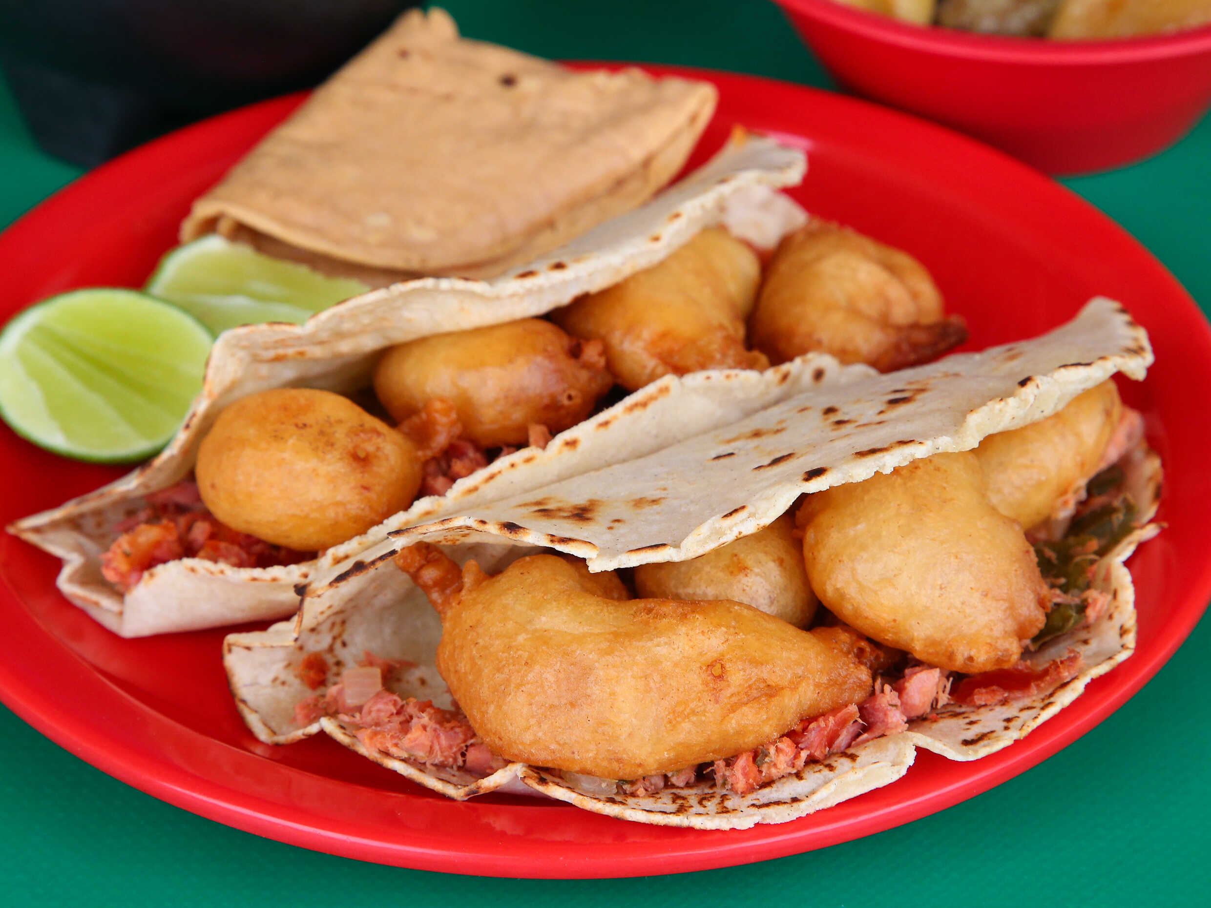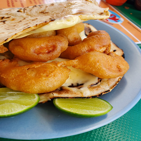 Quesadilla de maiz recien hecha con camarón capeado.