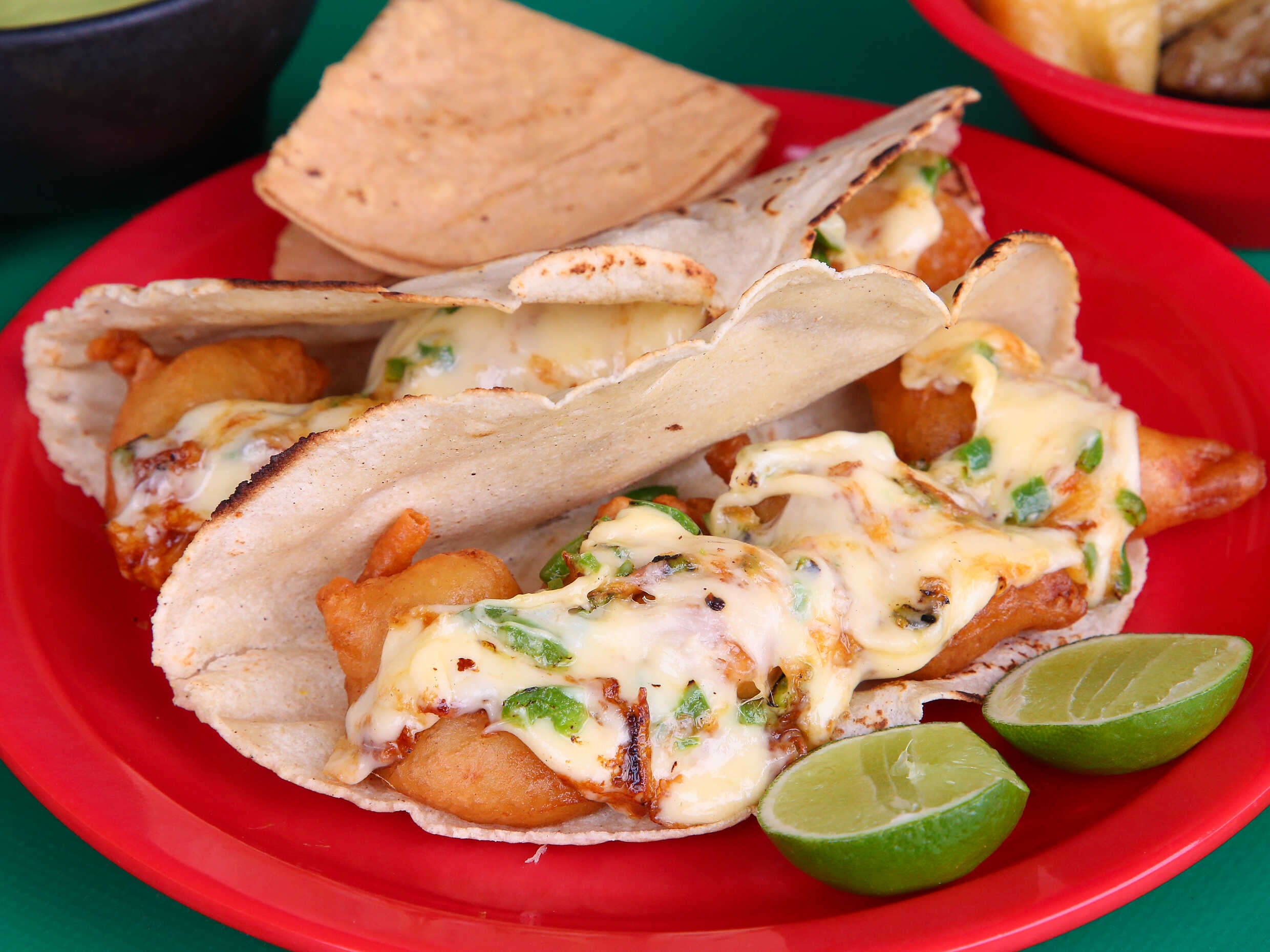 Quesadilla de maíz doble rellena de marlín y camarón capeado