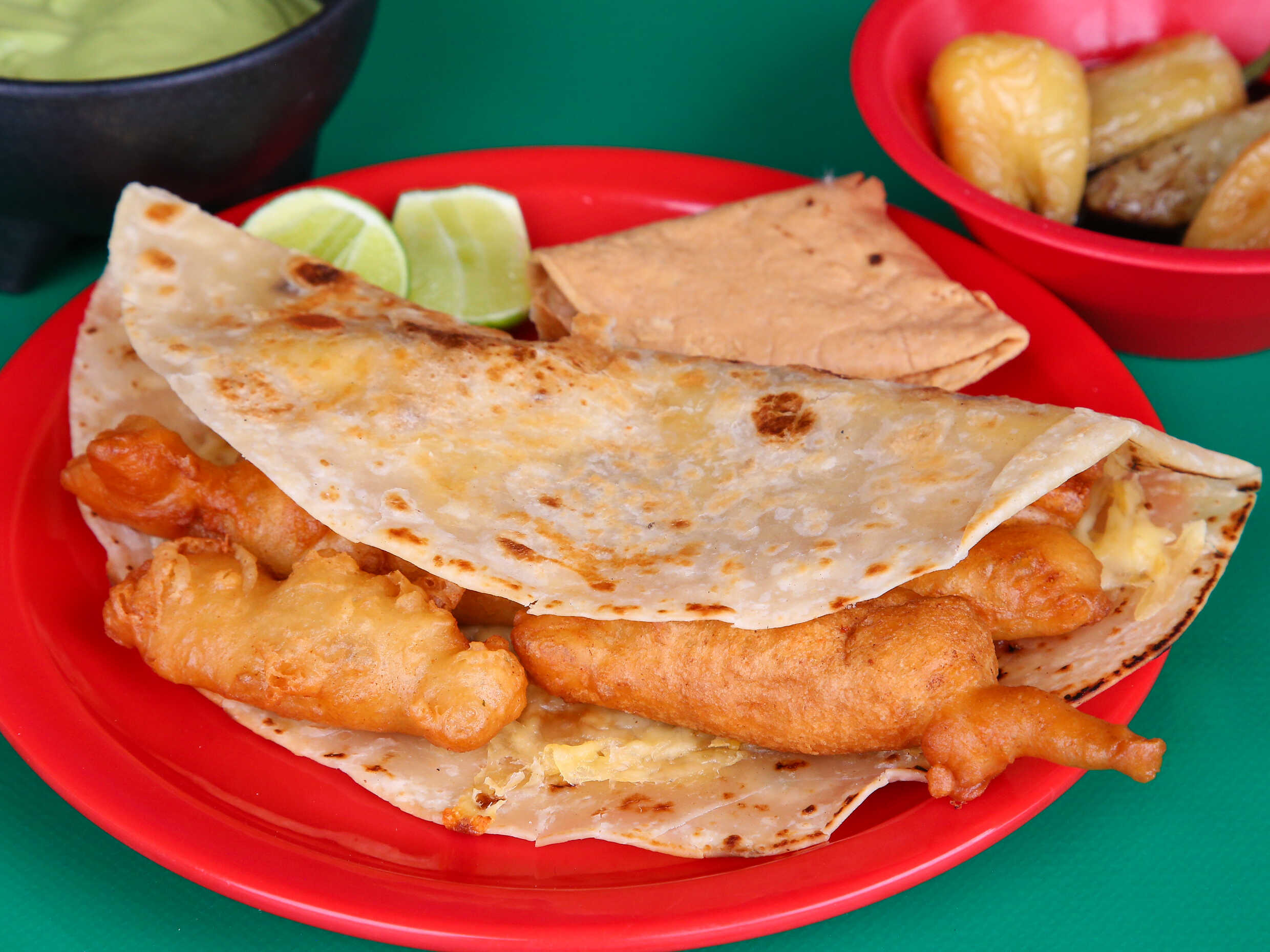 Quesadilla de harina con pescado capeado.