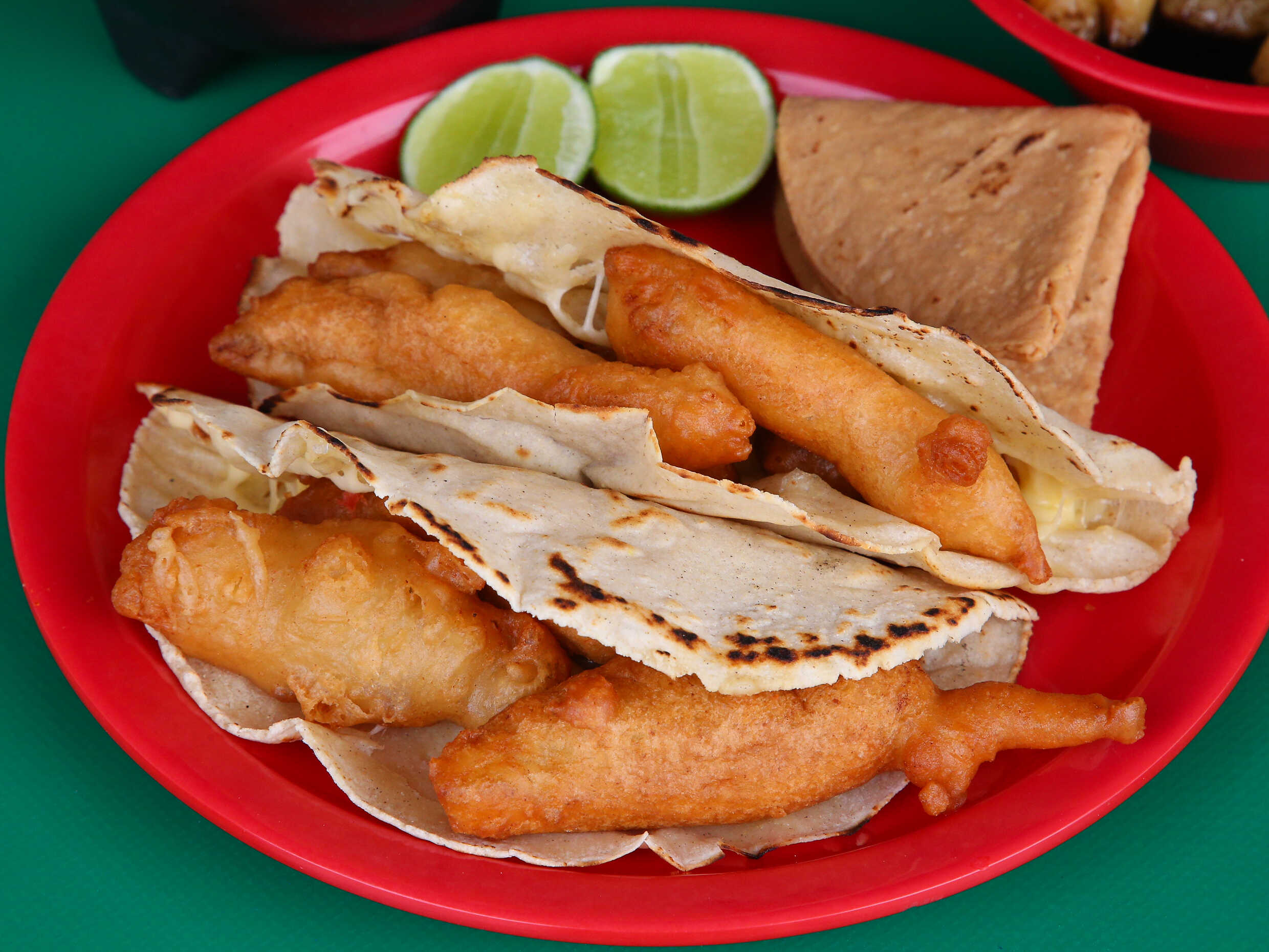 Quesadilla de maíz recien hecha con pescado capeado.