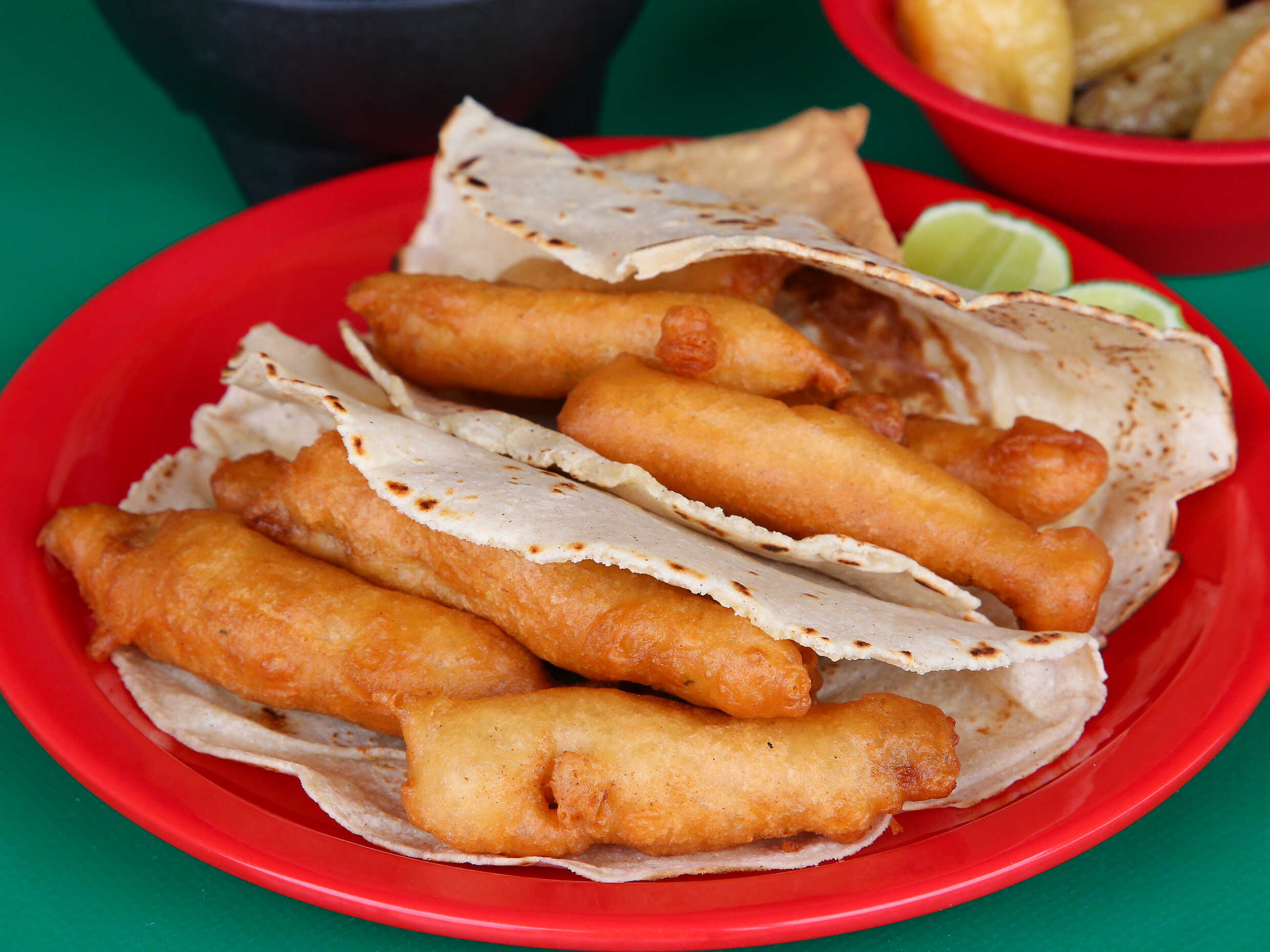 Tortilla de maiz recien hecha con pescado capeado.