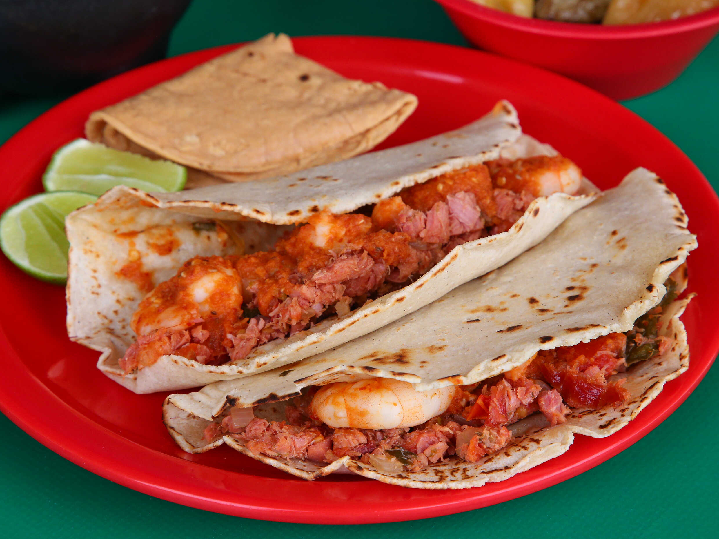 Tortilla de maiz recien hecha con camarón enchilado.