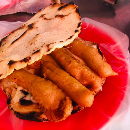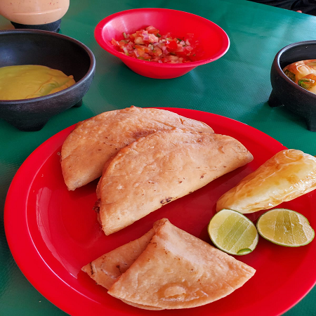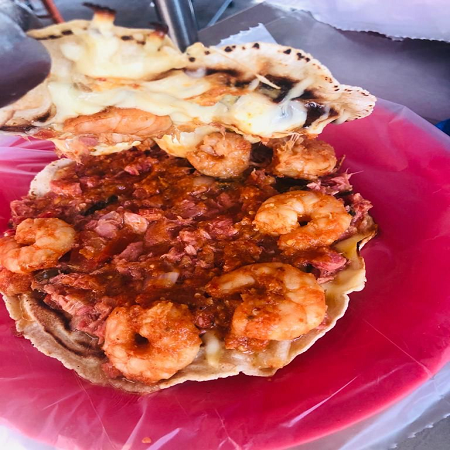 Tortilla de maíz frita en el aceite,rellena de queso y camarón.