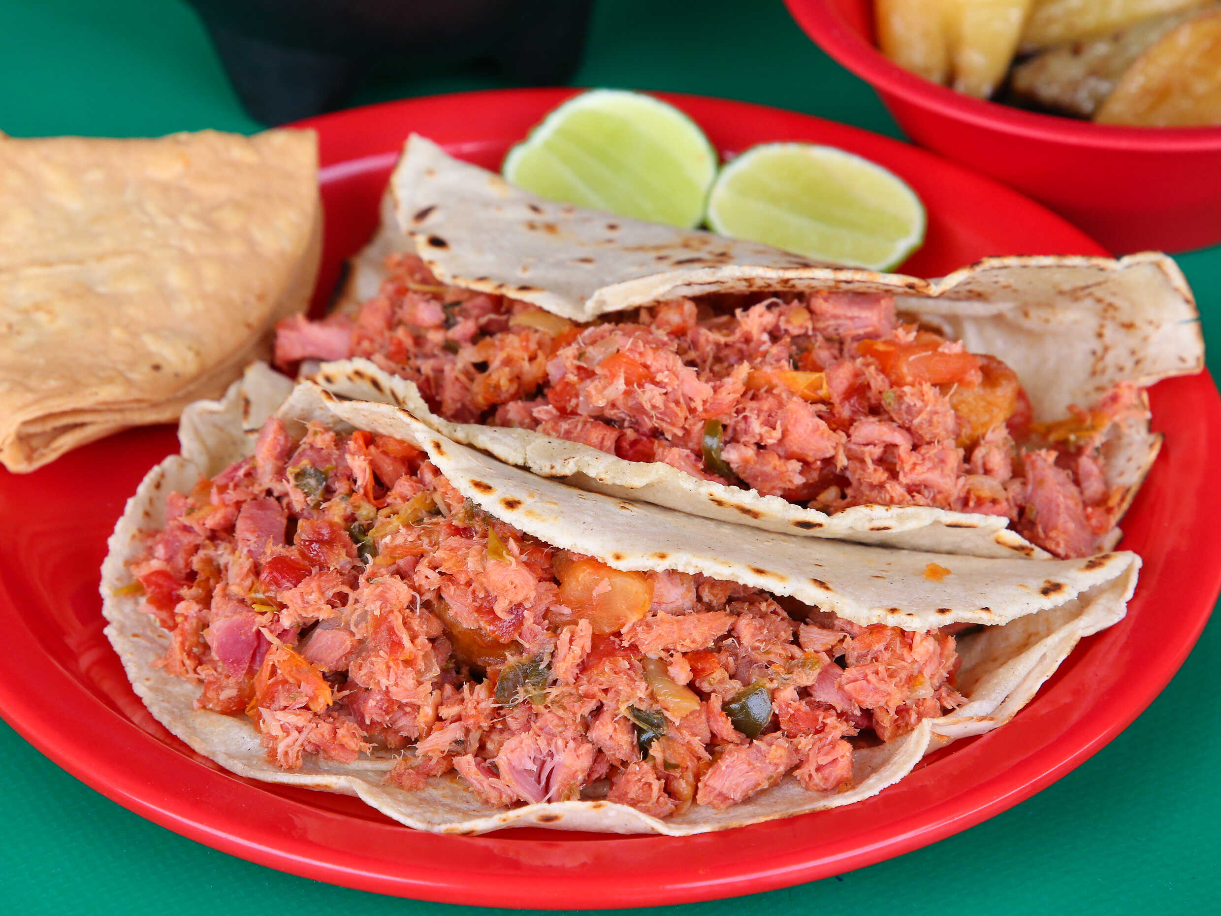 Tortilla de maiz recien hecha con marlin y camarón capeado. sin complementos